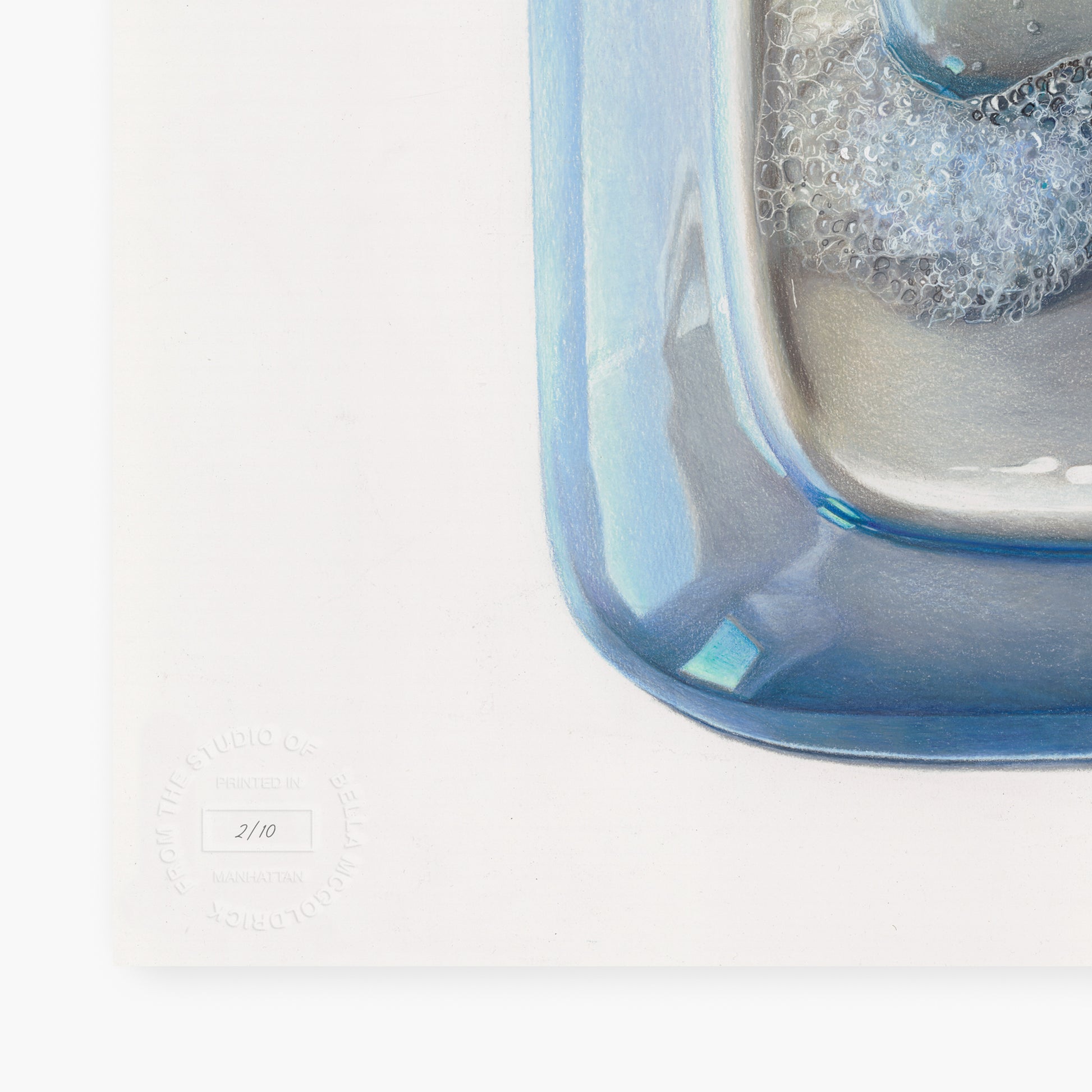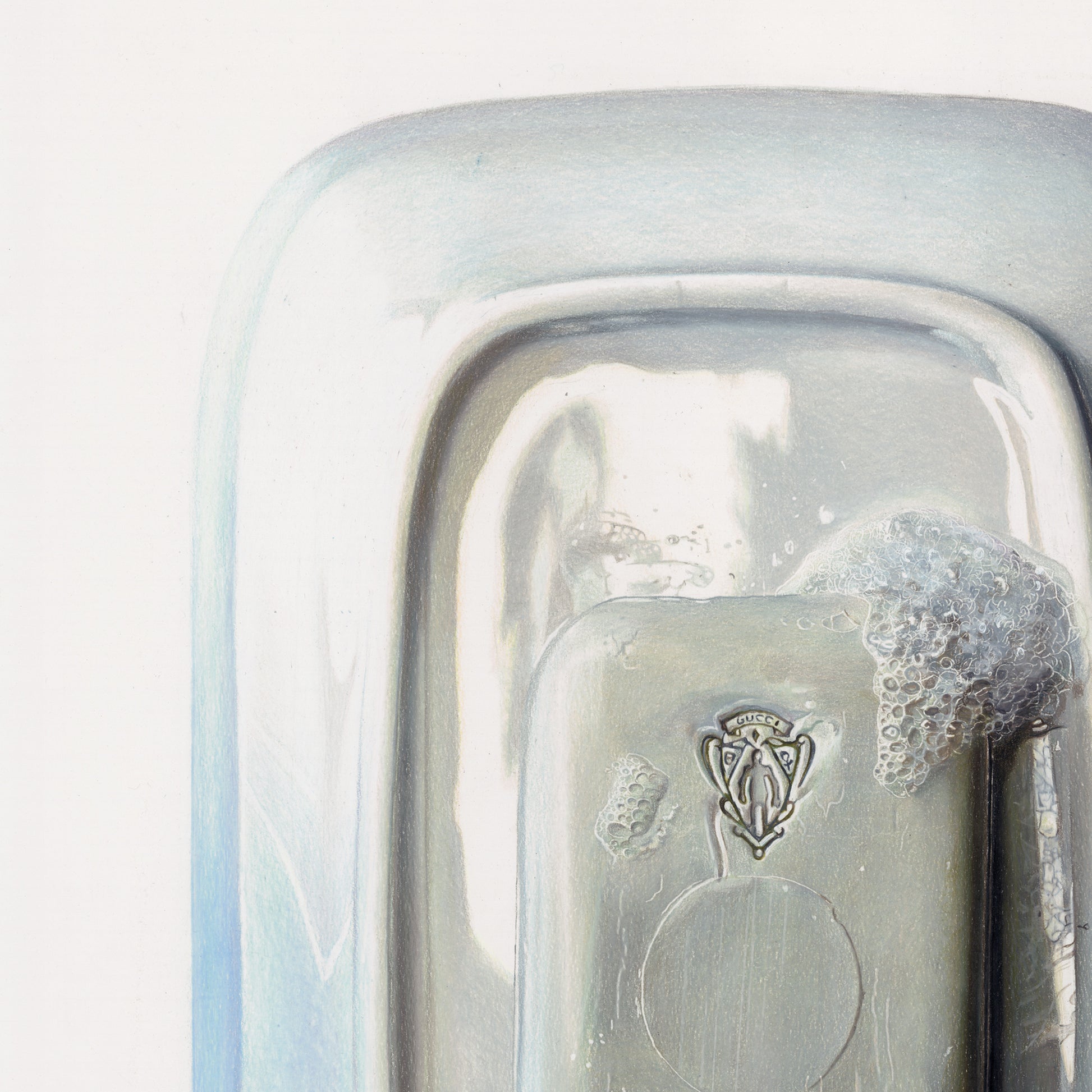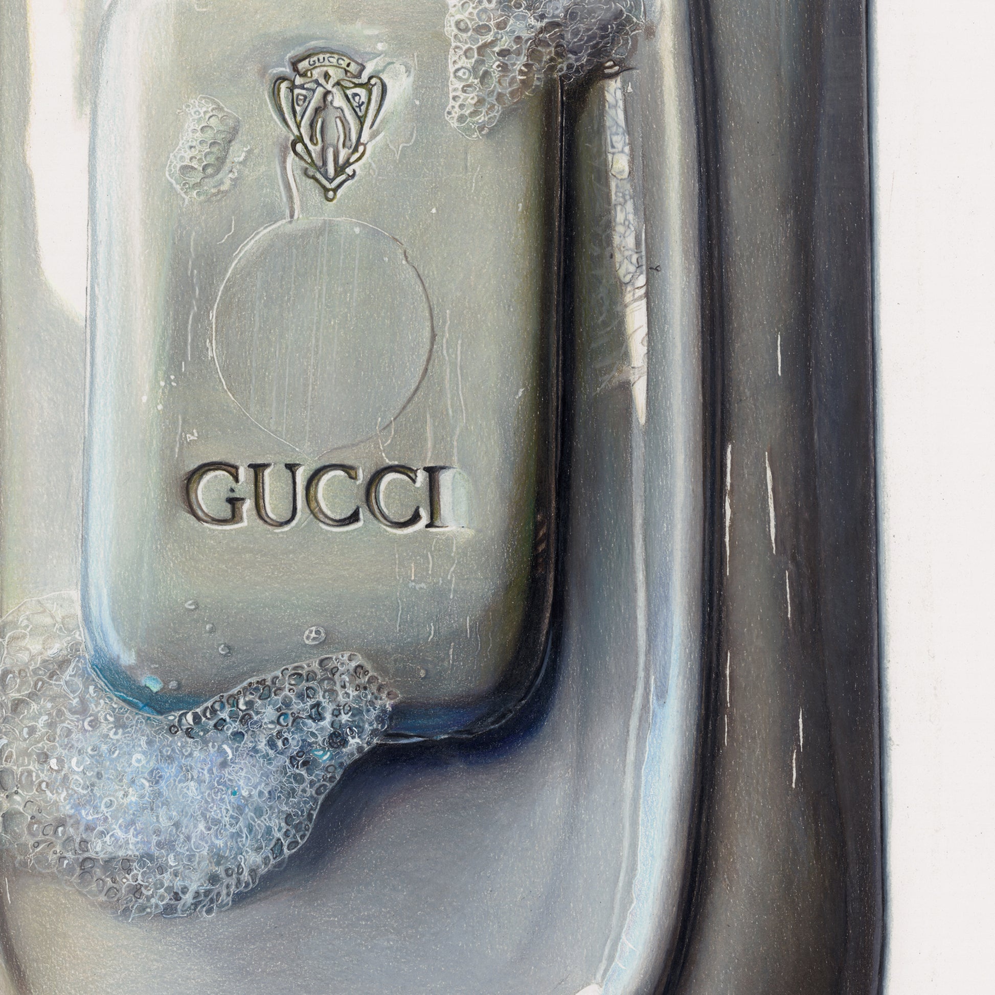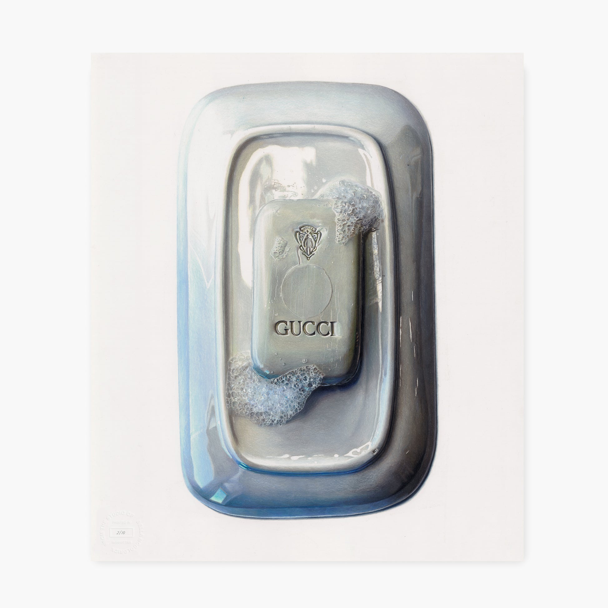 (2022) Perhaps her most minimal piece thus far, “Filthy Rich” is an original drawing in Bella McGoldrick’s signature hyper-realistic style, this time rendered in an array of grays and clean shades. For this piece, McGoldrick scoured eBay for designer soaps that had long since lost their pleasant aroma and was also inspired by Henrik Pruienne's photographs and their hazy nostalgia. The resulting work is a comment on wealth and luxury, the upside-down dish plate and now-soiled soap asking the question: how practical are luxury brands in any use, let alone an old bar of soap?