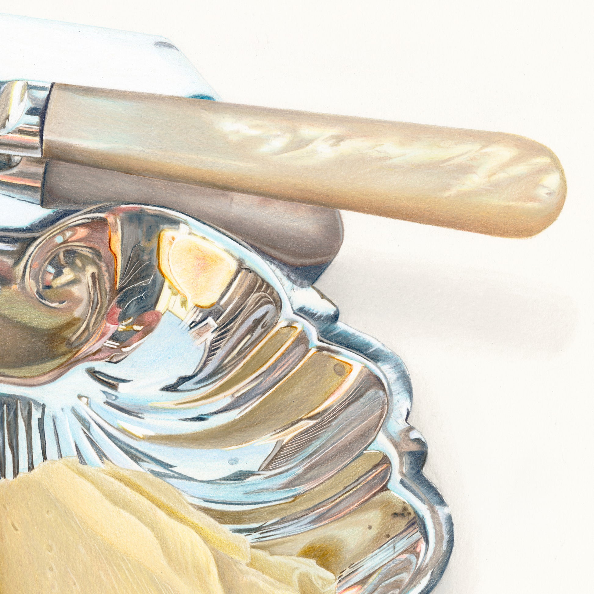 I want you to imagine sitting, a stiff white tablecloth waterfalling onto your knees as the sun hits your back that sits atop a small wicker chair at a small, very full round table. There is wine, there is also sparkling water, there is a silver basket, also starched-napkin-lined, filled with bread, there are frites, and more than you think you can eat. You will eat them all. The mayonnaise and ketchup come separately after you ask, they’re in individually portioned jars that pop as you twist them. The menus are too large for the table so you make your decision quickly, it’s easy anyway, you know the classics. You know what you came here for. It’s 2pm or 4pm or 9pm without the sun on your back, but the cigarette smoke lingers always and never smelt so unoffensive, it’s only how this outdoor setting is supposed to smell. The butter to your bread is served in a sterling silver clam shell with a pearl-handled knife and it distracts you from the pedestrians for a moment. Actually, it whisks your heart away and back again, landing it back in the present of this perfect dining experience in Paris, replicated worldwide and in this artwork, but always, only, in Paris.