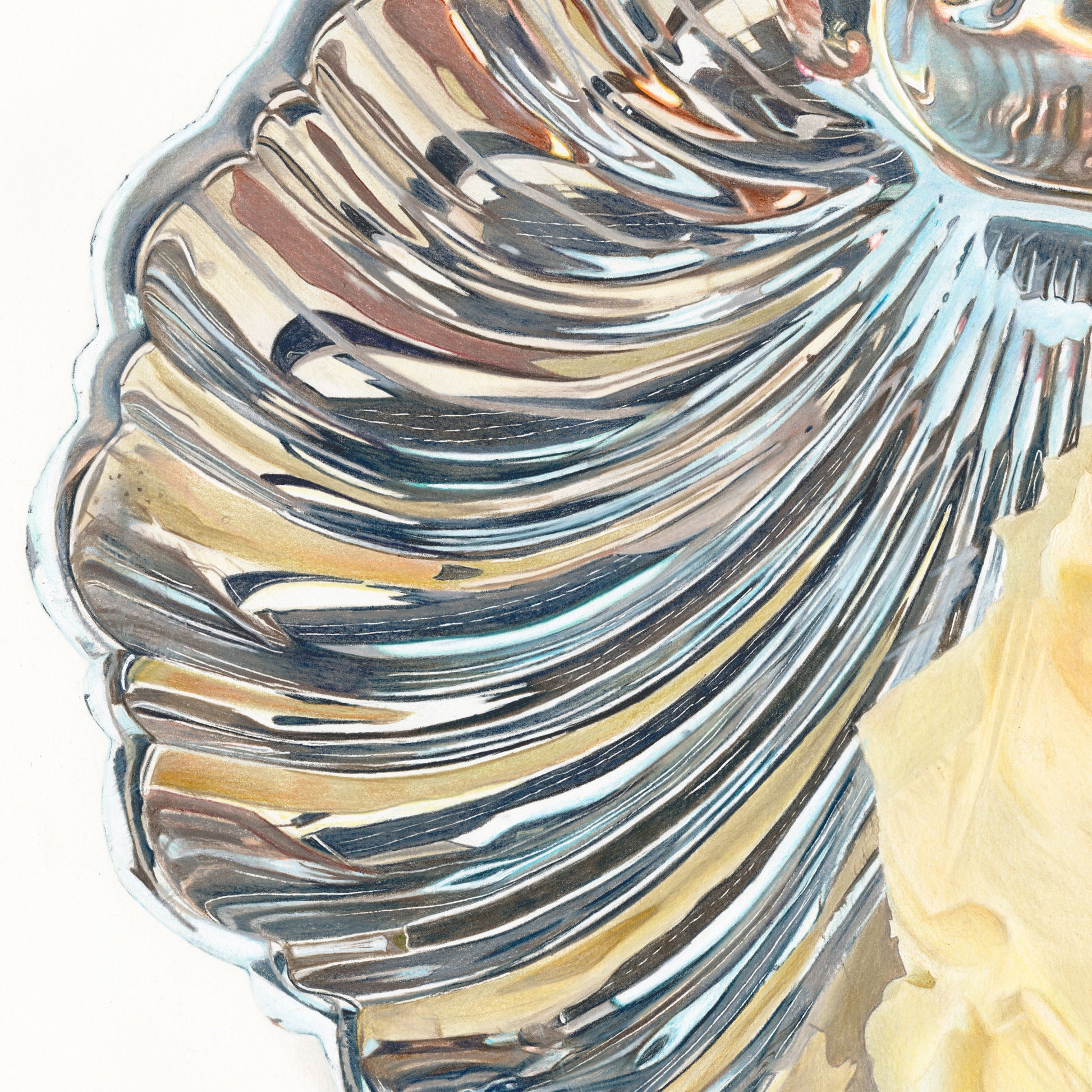 I want you to imagine sitting, a stiff white tablecloth waterfalling onto your knees as the sun hits your back that sits atop a small wicker chair at a small, very full round table. There is wine, there is also sparkling water, there is a silver basket, also starched-napkin-lined, filled with bread, there are frites, and more than you think you can eat. You will eat them all. The mayonnaise and ketchup come separately after you ask, they’re in individually portioned jars that pop as you twist them. The menus are too large for the table so you make your decision quickly, it’s easy anyway, you know the classics. You know what you came here for. It’s 2pm or 4pm or 9pm without the sun on your back, but the cigarette smoke lingers always and never smelt so unoffensive, it’s only how this outdoor setting is supposed to smell. The butter to your bread is served in a sterling silver clam shell with a pearl-handled knife and it distracts you from the pedestrians for a moment. Actually, it whisks your heart away and back again, landing it back in the present of this perfect dining experience in Paris, replicated worldwide and in this artwork, but always, only, in Paris.