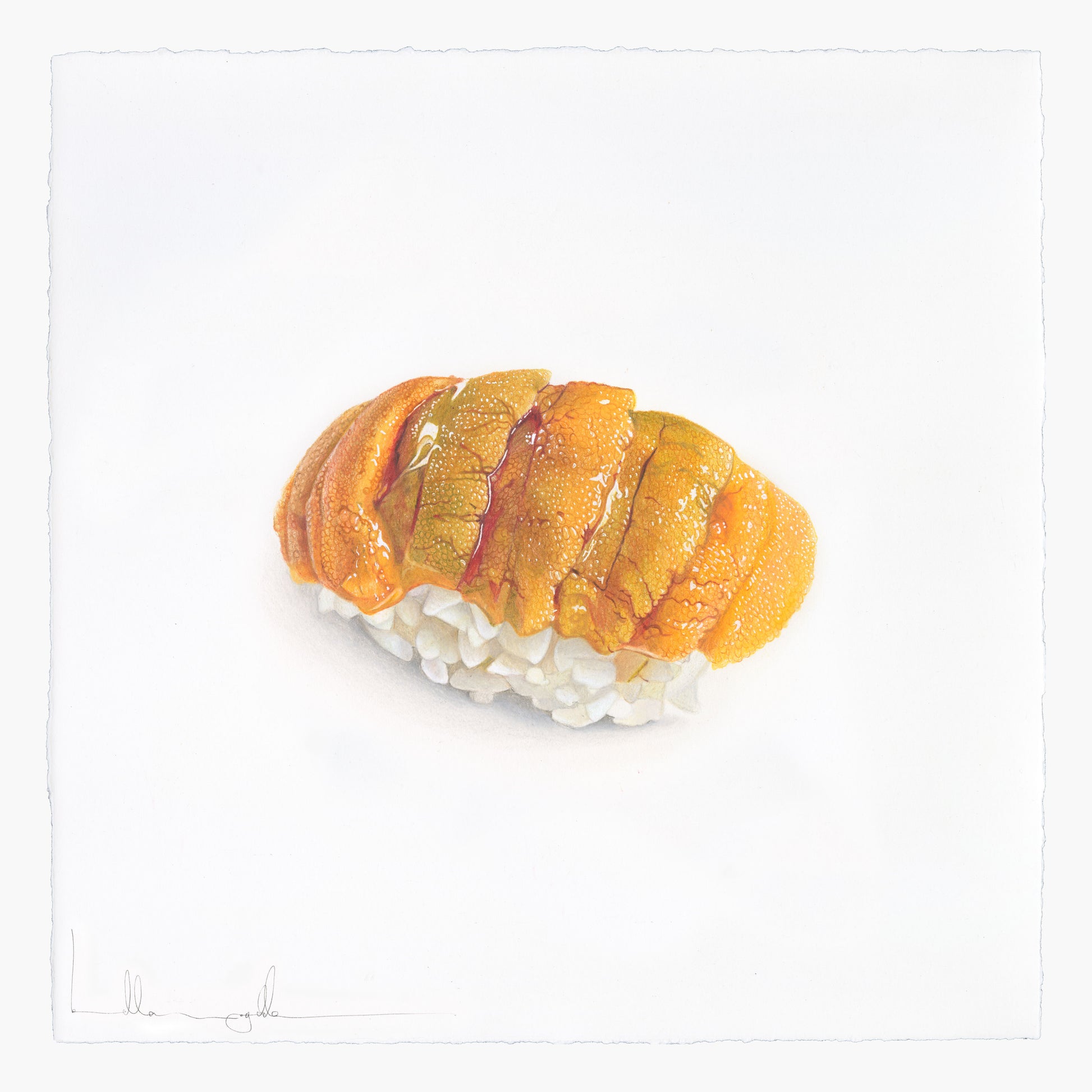 It had been explained to me as the taste of the ocean. That never appealed to me, as a descriptor. Same goes for oysters. I’ve never gulped a mouthful of seawater, to which I’ve done countless times, and thought… how tasty, what a delight! Therefore, my description of the delicacy is of its texture, unbelievable texture, unparalleled in the western world, in any world perhaps, but I can’t be a judge of it all. It’s fleeting and its beauty, as all real and deep beauty ought to be. A moment of excitement, then only a hold on our memories. As I sit to try to describe the taste after shooting down the only descriptor I know, I’m left wordless. I love it, and look how beautiful it is to be drawn. Tiny, baby particles held together, slightly perhaps, like our tongues, but the only similarity it has to our tongue is that they play so nicely together.