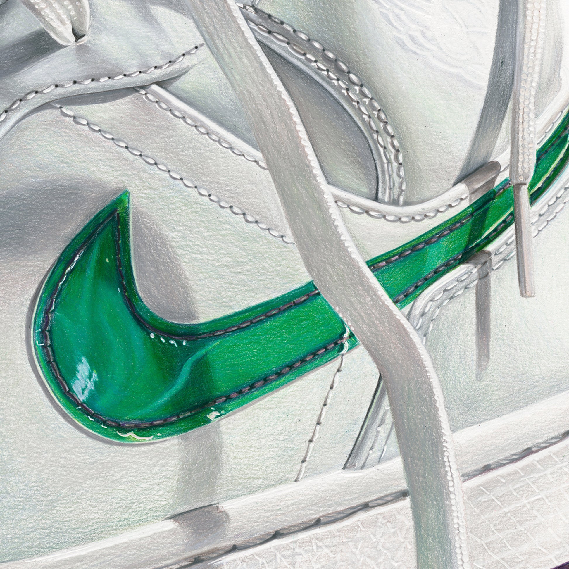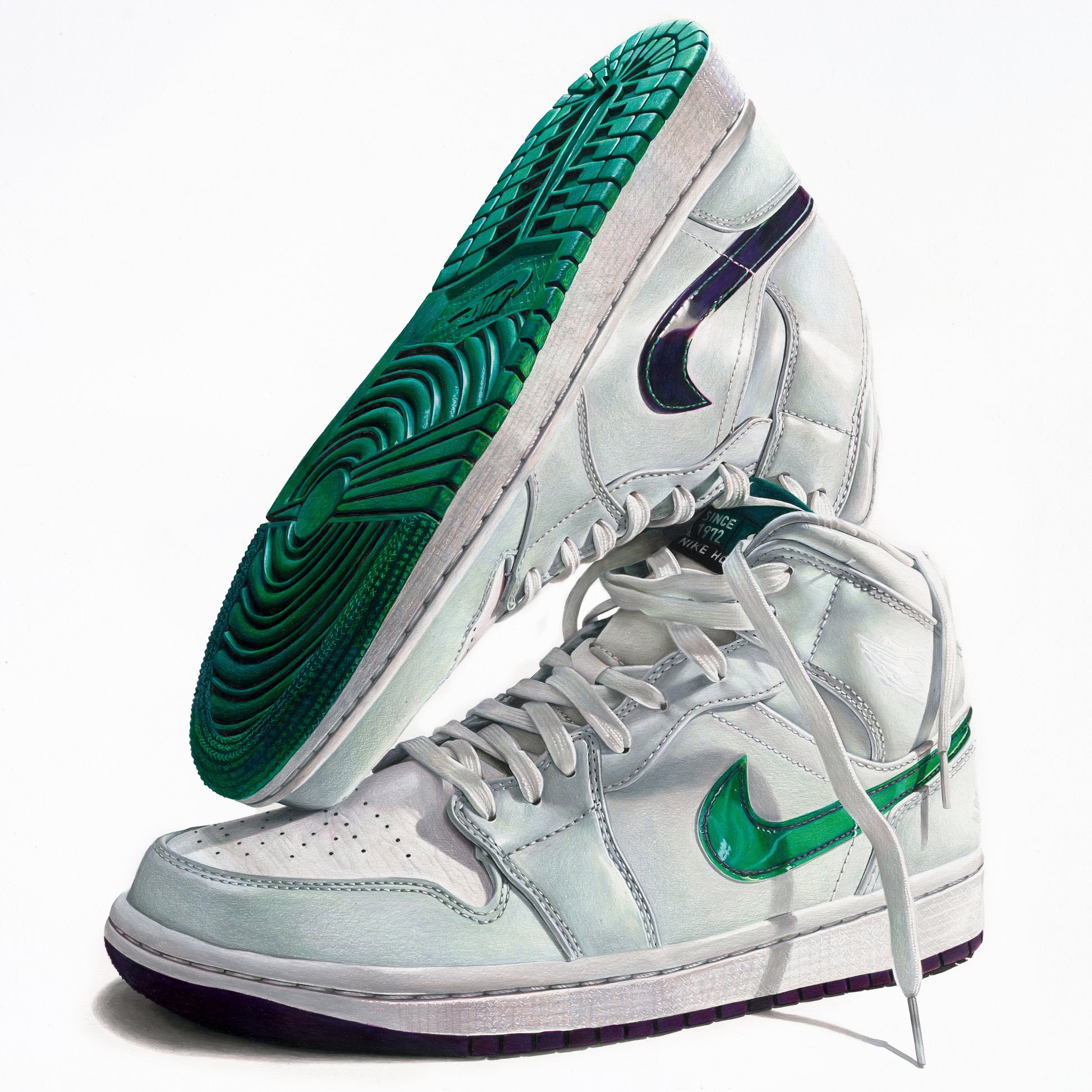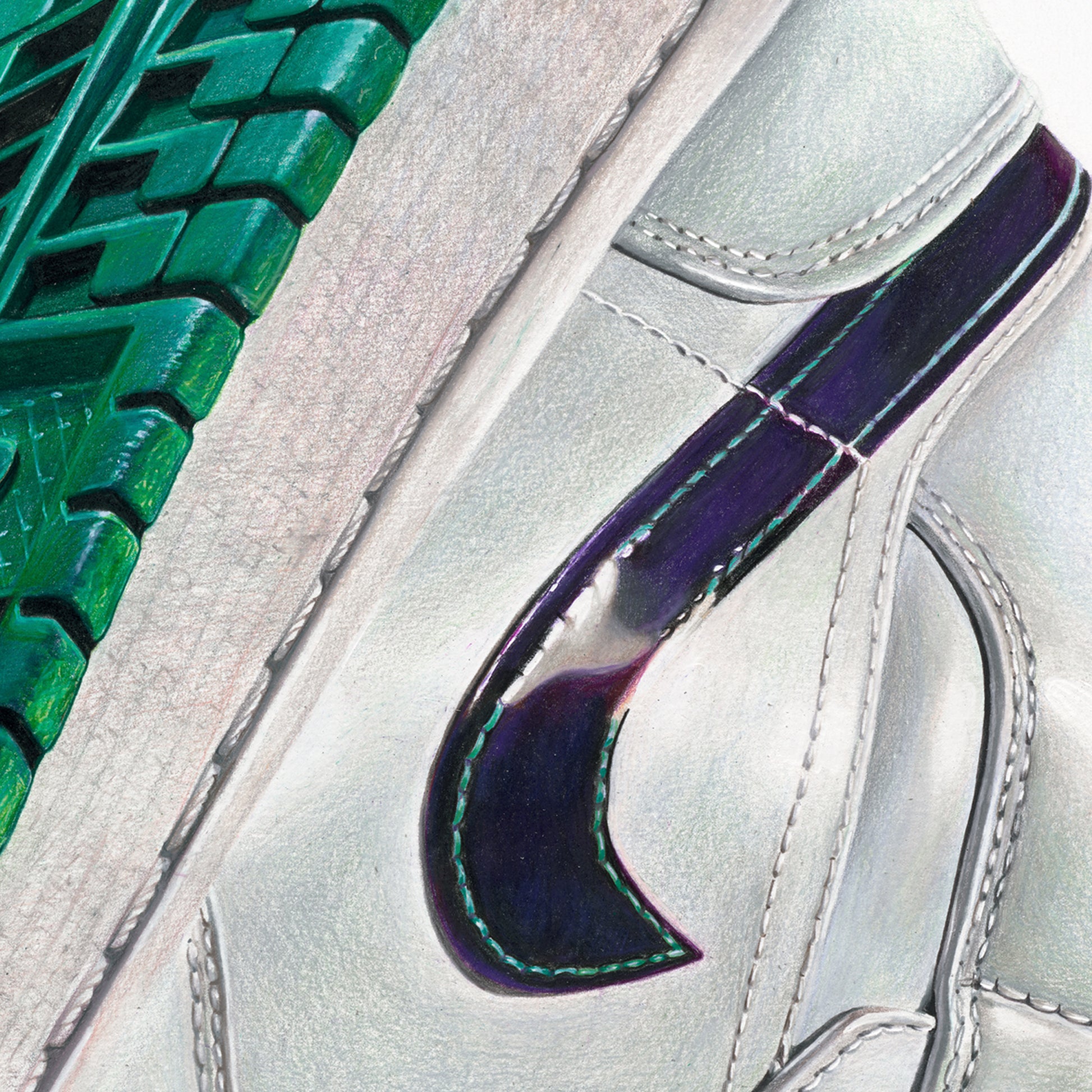A 2020 commission, which took me away from my usual element of things with mouth pleasure. Usually a barefoot wearer or inappropriate heels at a casual affair, I felt slightly out of my comfort zone but very in my comfort of colouring. Comfort in textures and details, in the shadows that cast into the crevasses of the sole, in the reflections of the PVC swooshes and the ribbing of the laces. Comfort in the composition, in the statuesque configuration and display of footwear. This is how I display beloved items at home, like a proud hoarder of material things for which I swapped my money. Shoes are status. Shoes are, now, art.