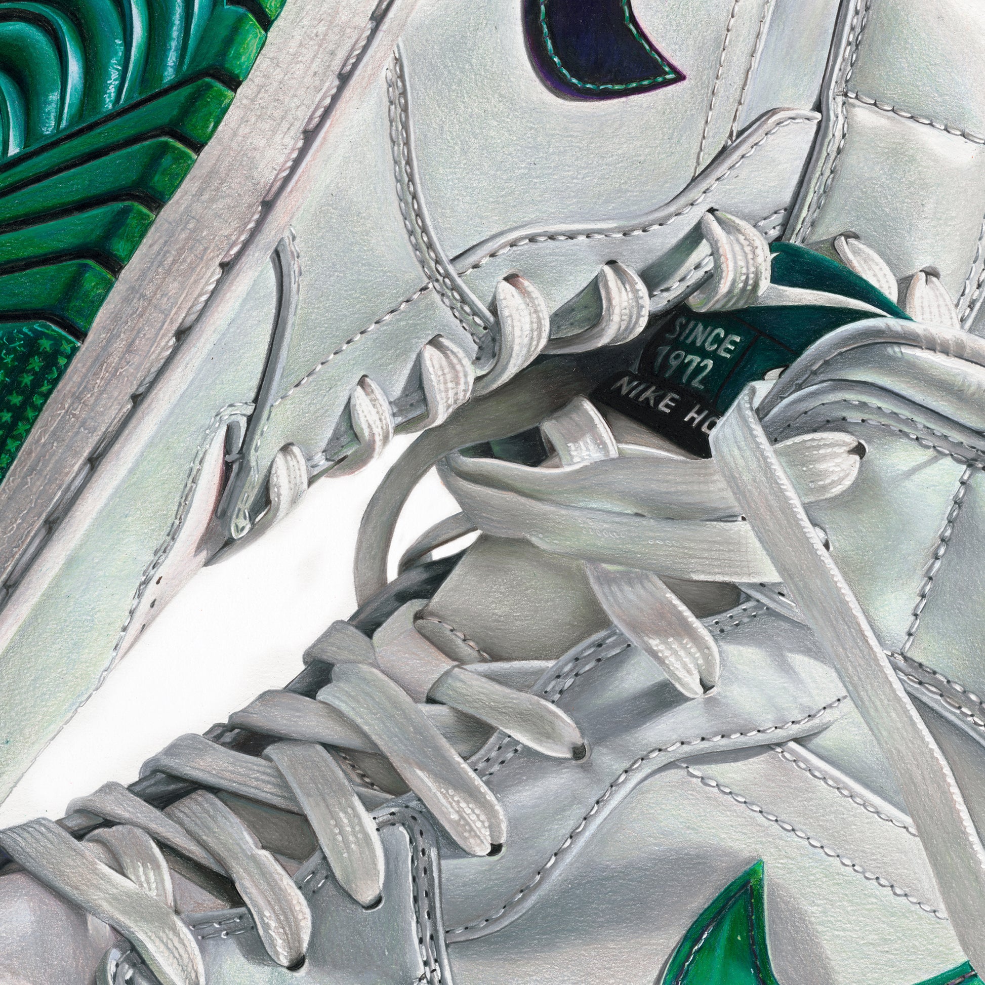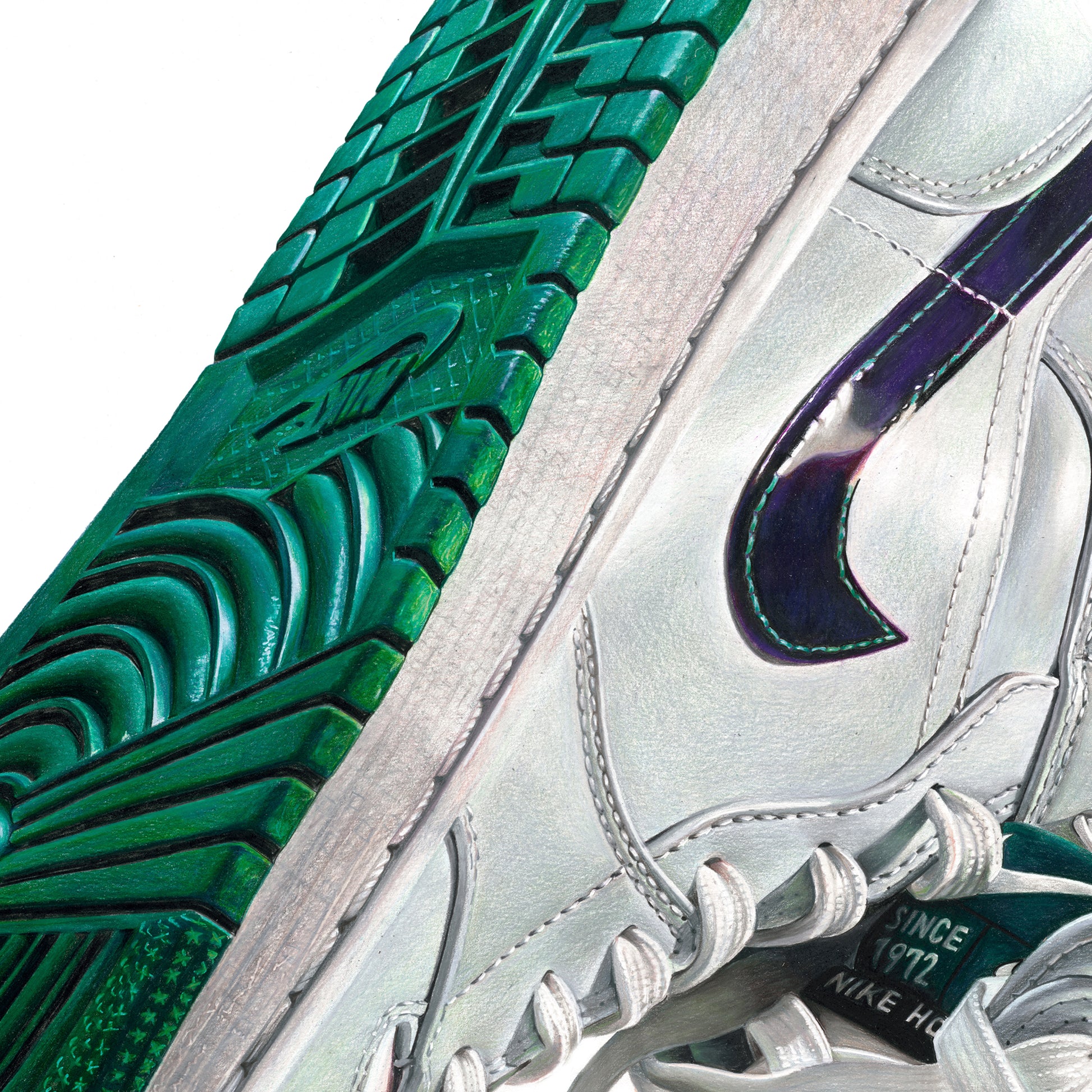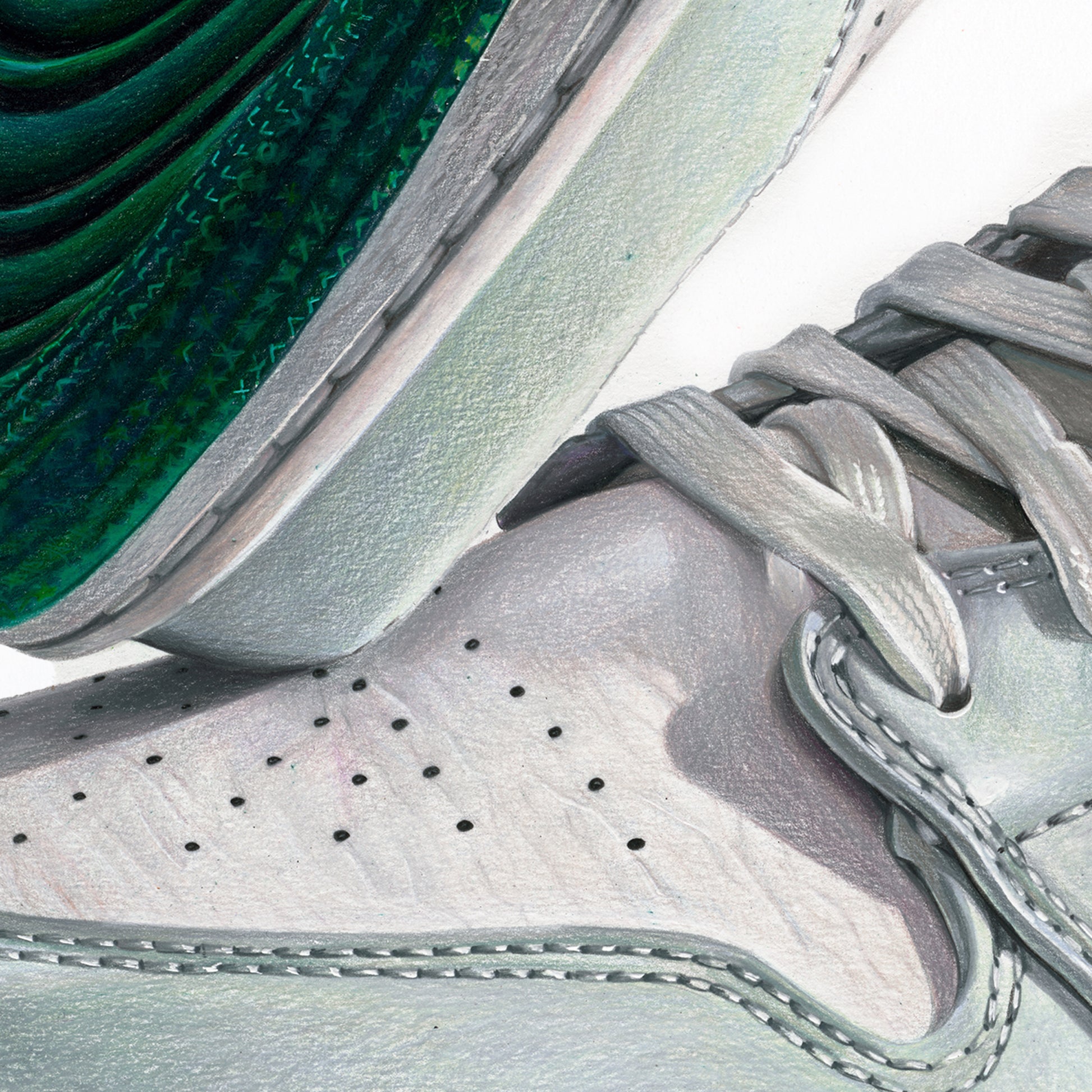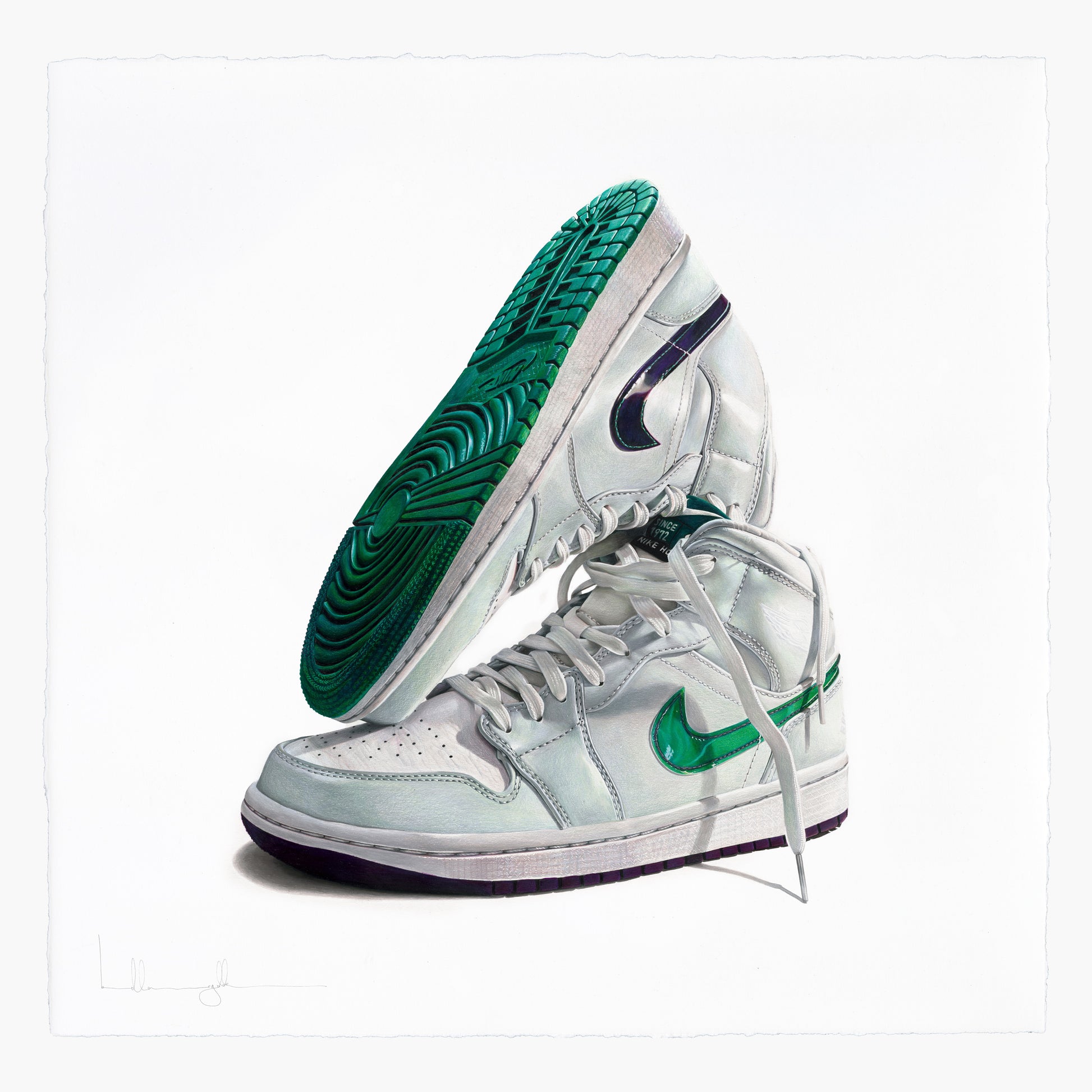 A 2020 commission, which took me away from my usual element of things with mouth pleasure. Usually a barefoot wearer or inappropriate heels at a casual affair, I felt slightly out of my comfort zone but very in my comfort of colouring. Comfort in textures and details, in the shadows that cast into the crevasses of the sole, in the reflections of the PVC swooshes and the ribbing of the laces. Comfort in the composition, in the statuesque configuration and display of footwear. This is how I display beloved items at home, like a proud hoarder of material things for which I swapped my money. Shoes are status. Shoes are, now, art.