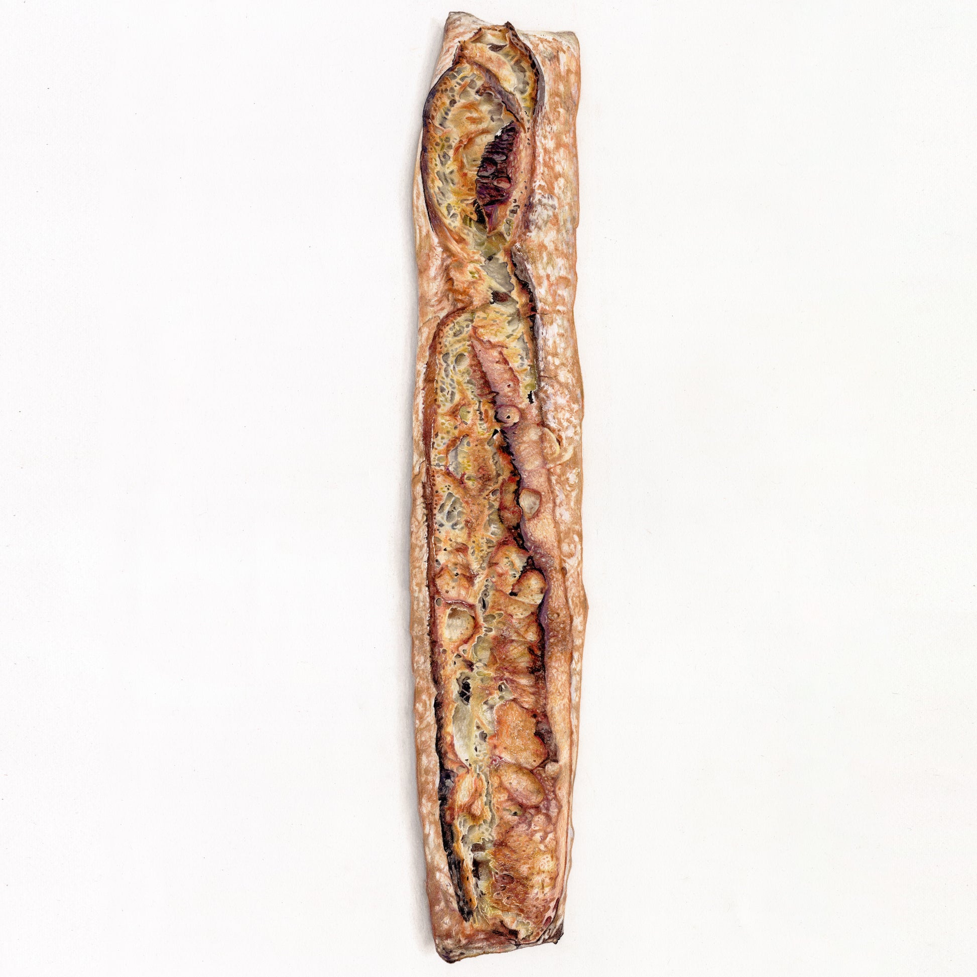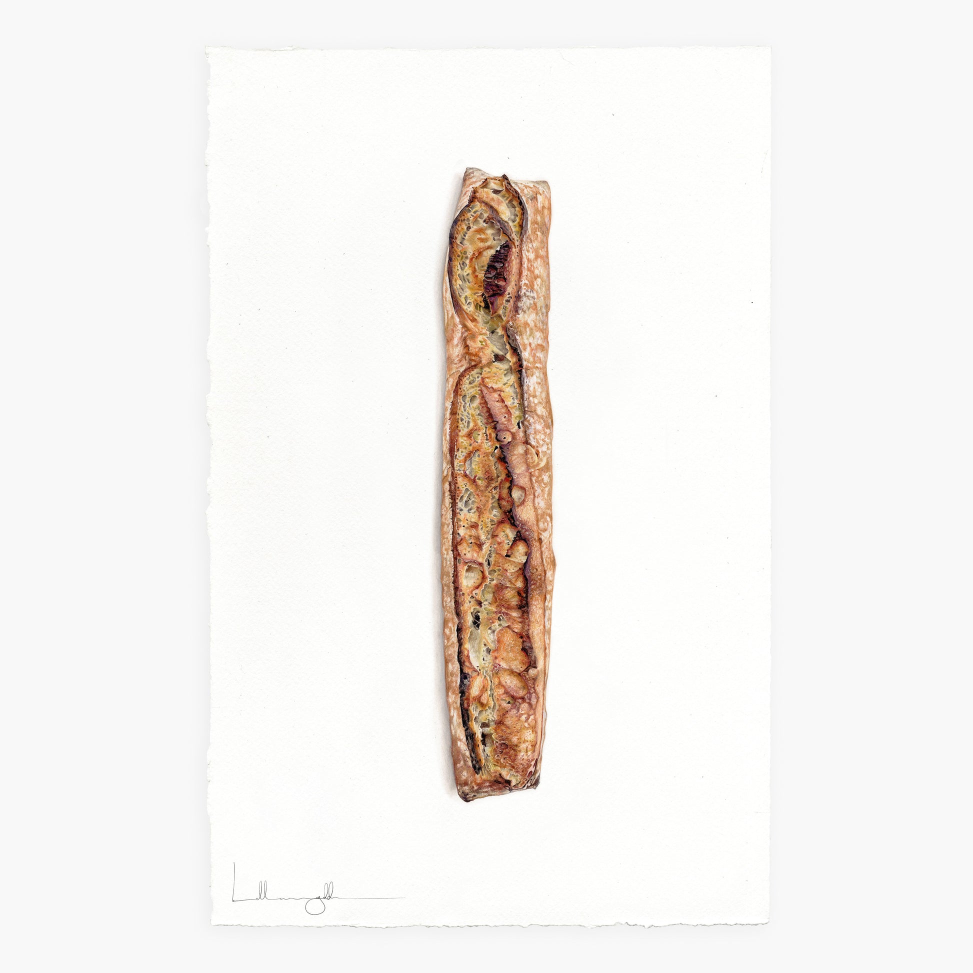 More iconic than the Eiffel Tower, maybe in fewer photographs but certainly not on my phone. The pleasure it gives me, when literally anywhere in France are the many, many people walking about their day, with one or three baguettes under their arms. The pleasure. The sight! Give us our daily bread, we pray. The French understood that, to a deep fundamental level. What else do you need? Good bread, good company, and a good pair of legs to get you from your apartment to the boulangerie and back, perhaps with a cigarette but it’s only advised, not compulsory. I had to give her a moment, start with the essentials. She only lasts a day, she can very easily be made for one, but she’s best torn and shared. The giver of life, the distinction of origins found in her shape. Life-size I have drawn her, in all of her glory and none of her embellishments, as God would’ve wished.