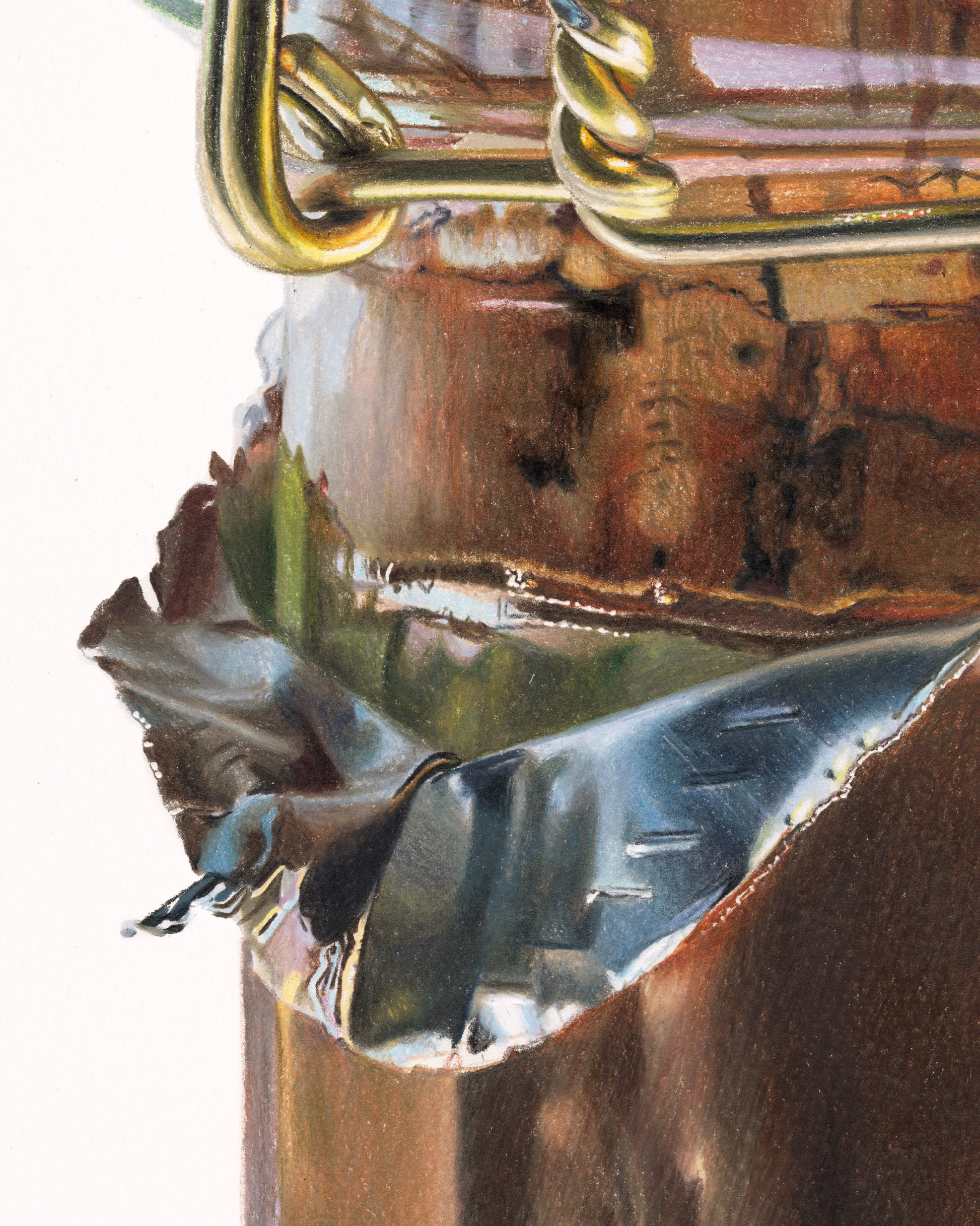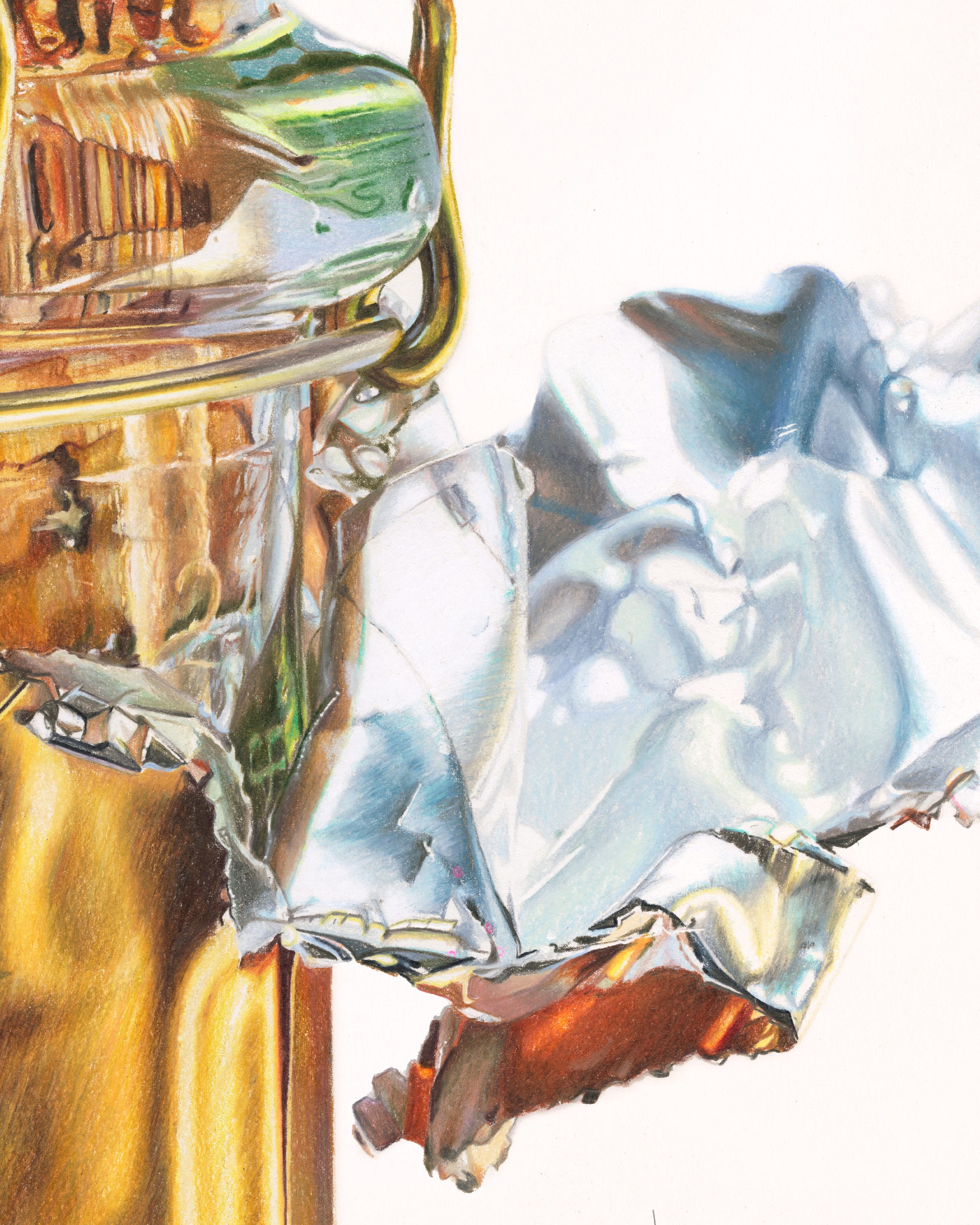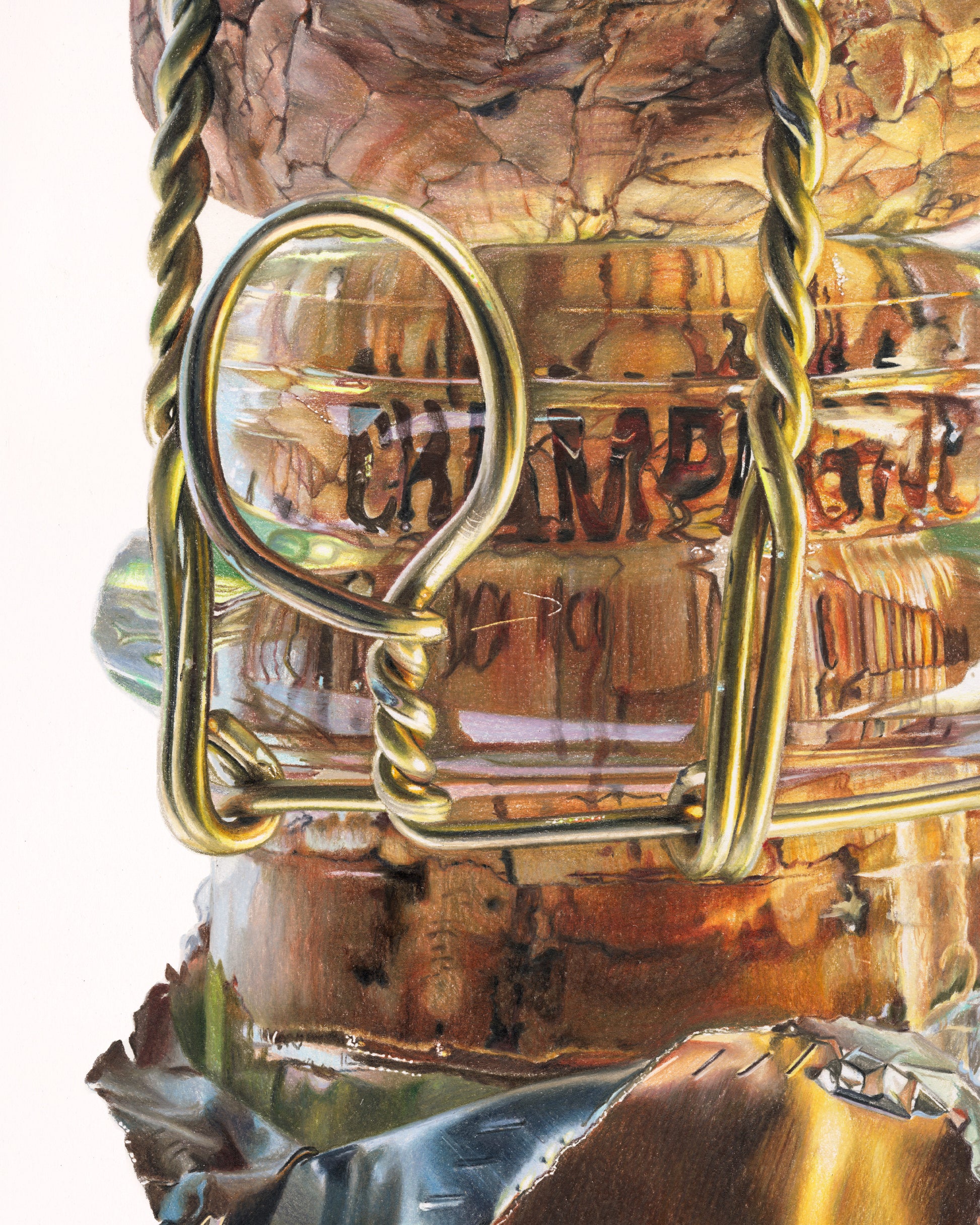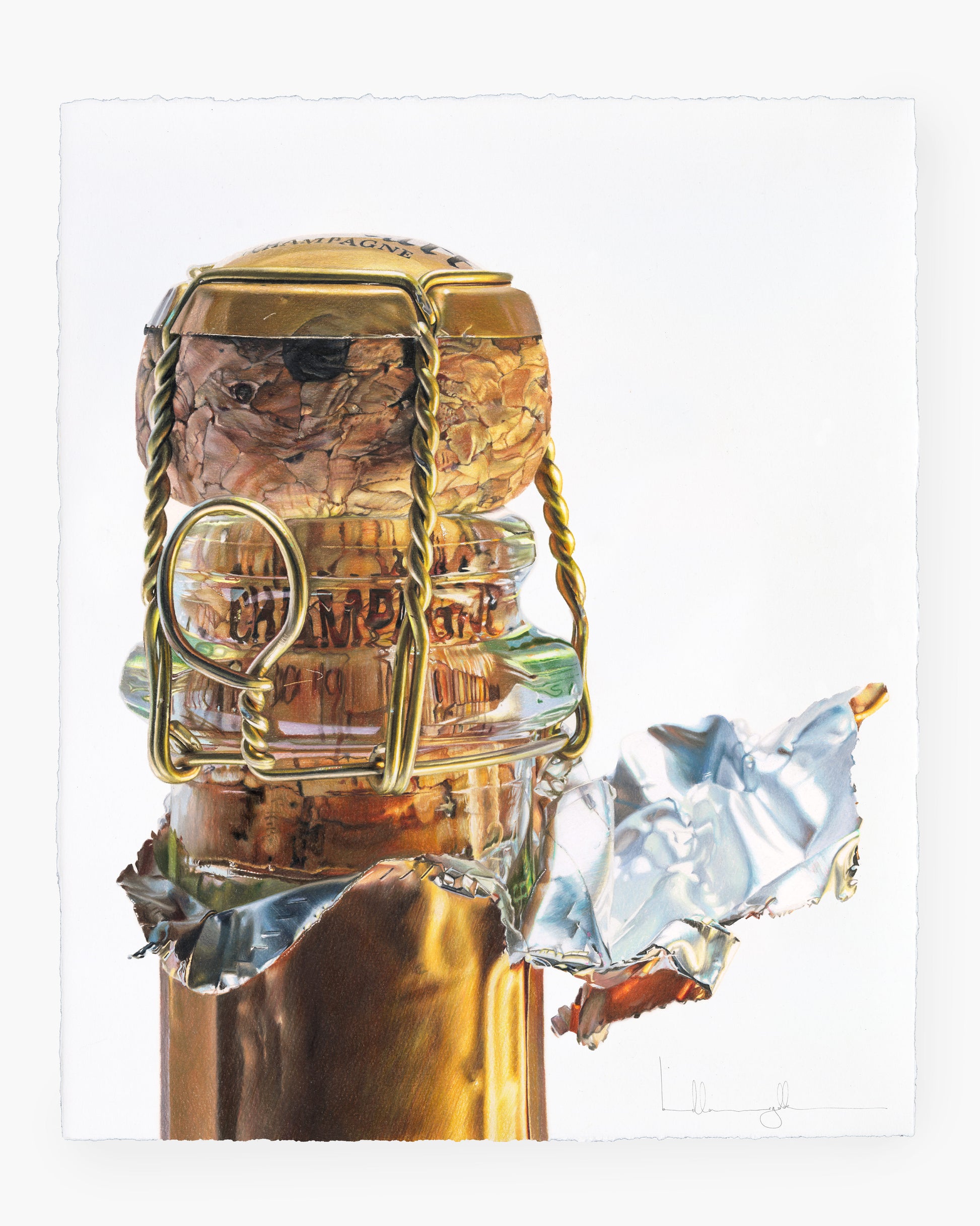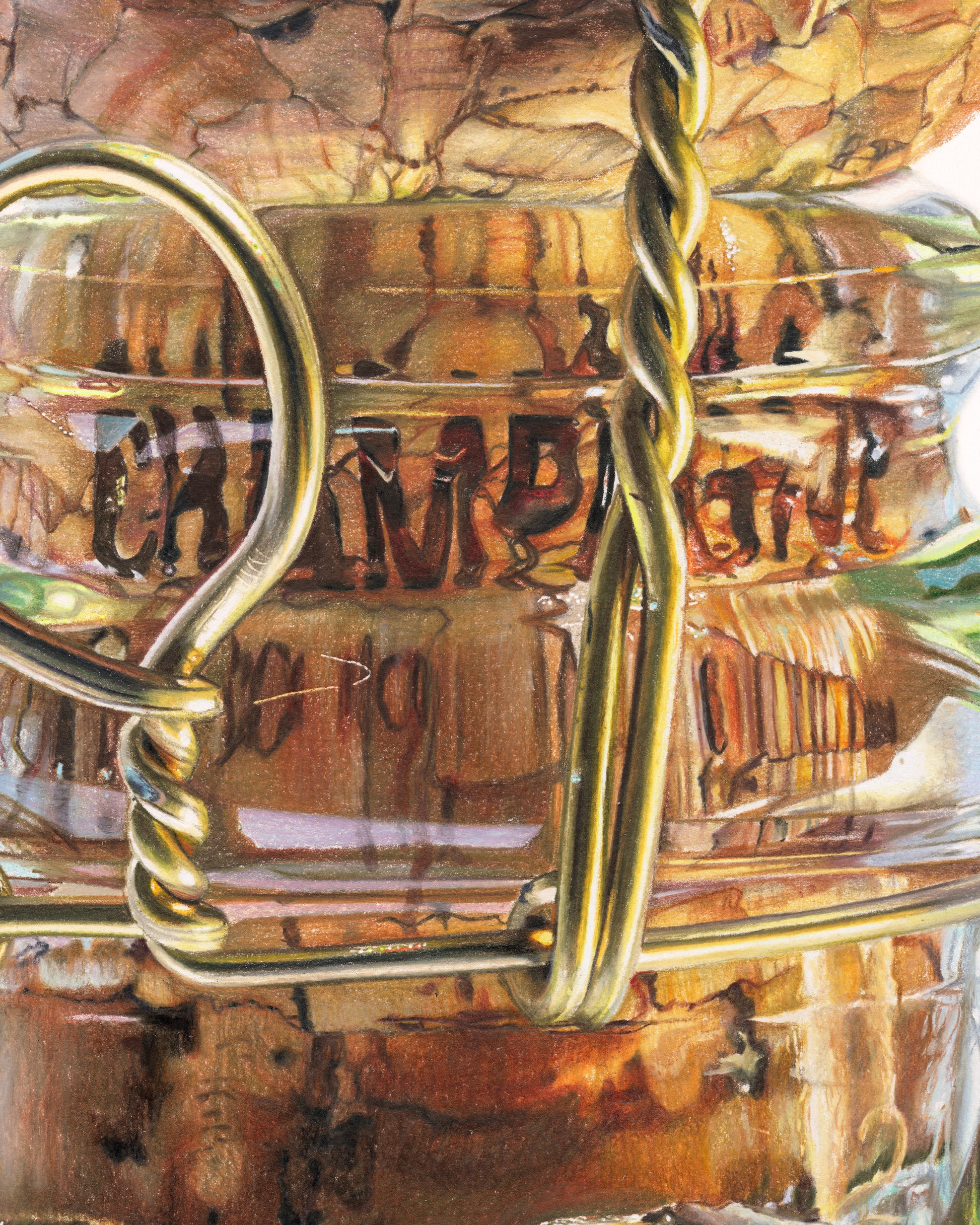 I am home here. This artwork reminded me of where I come from, not from Champagne, but from the smallest details in a small object that I declare worthy of size. Worthy of pause from you and a month from me. Pure love in the fractures through the thick bottleneck glass. Safety in the bounce of light from a torn foil casing. As easy as this drink might fall down one's throat, this drawing took me into the place where I can get drunk. Happy New Year, and as I so love to say, bottoms up.