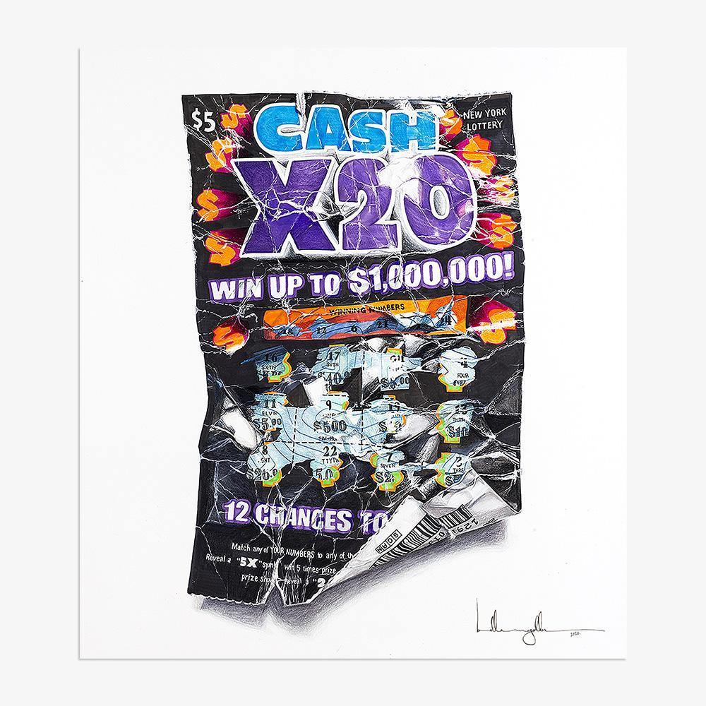 (2018) McGoldrick’s photorealistic still-life drawings capture the intimacy and life of the objects we wear, eat, and handle on a daily basis. These used, pre-adored, and often discarded objects are instilled with a sense of curiosity and sentimentality towards the people that once utilized these now forgotten artifacts of daily life. McGoldrick’s depiction of lotto scratch-offs found crumpled on the streets of New York City, conveys how these forlorn objects, once ripe with the potential of delivering the American dream, are now memorialized, with every crease and crevice filled with the possibility of what could have been.