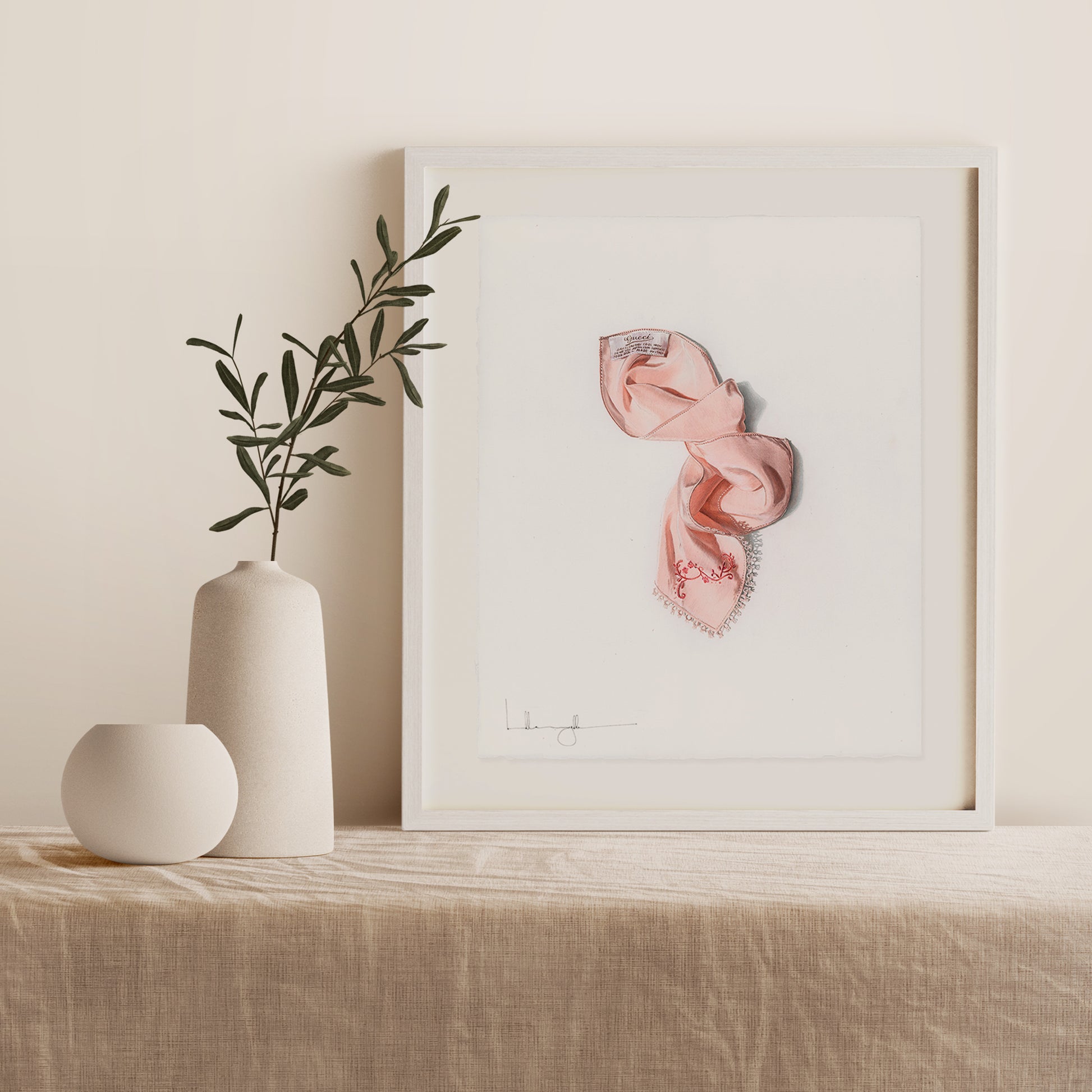 I’ve been collecting vintage designer labels and found a silk Gucci tie in Florence for €98, the handmade napkin was €15. The latter was better, by a mile, and I wanted people to admire it. The vintage Gucci label is beautiful also, so this is my composition.