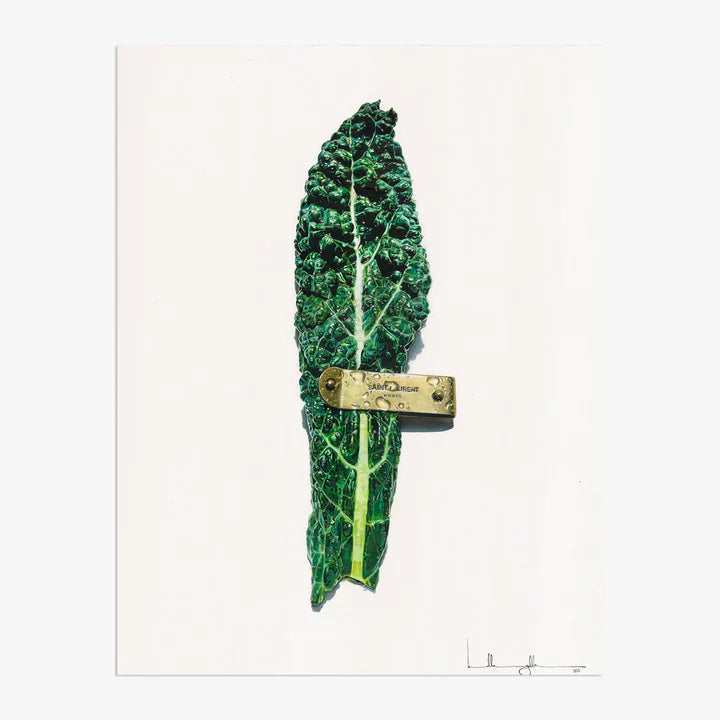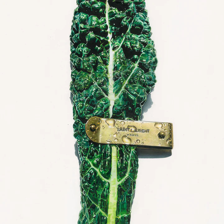(2022) "Health Is Wealth" winks at the viewer. Just to be confusing and match this artwork to her "Wealth is Health" piece, this new original work by Bella McGoldrick looks at the same idea in a different frame. The most expensive kale one can purchase stands in high relief against a crisp white background and begs the question: what are our priorities? Does the high price of Organic Tuscan kale make it better for us? What does the branded money clip hold? This stunning work of luscious greens and gold prompts the viewer to meditate on the adage that without our health we have nothing — and ask ourselves what we have without conspicuous consumption.