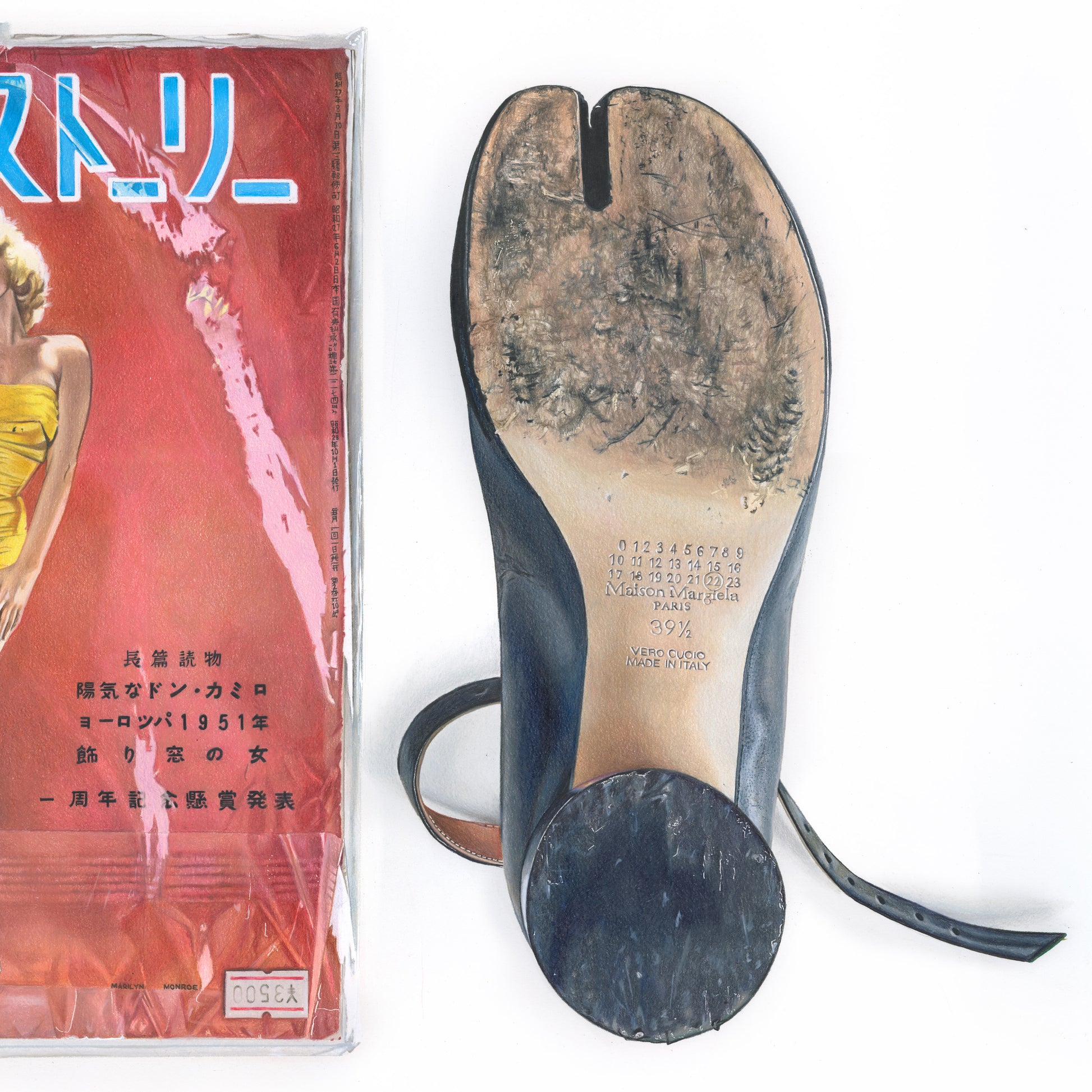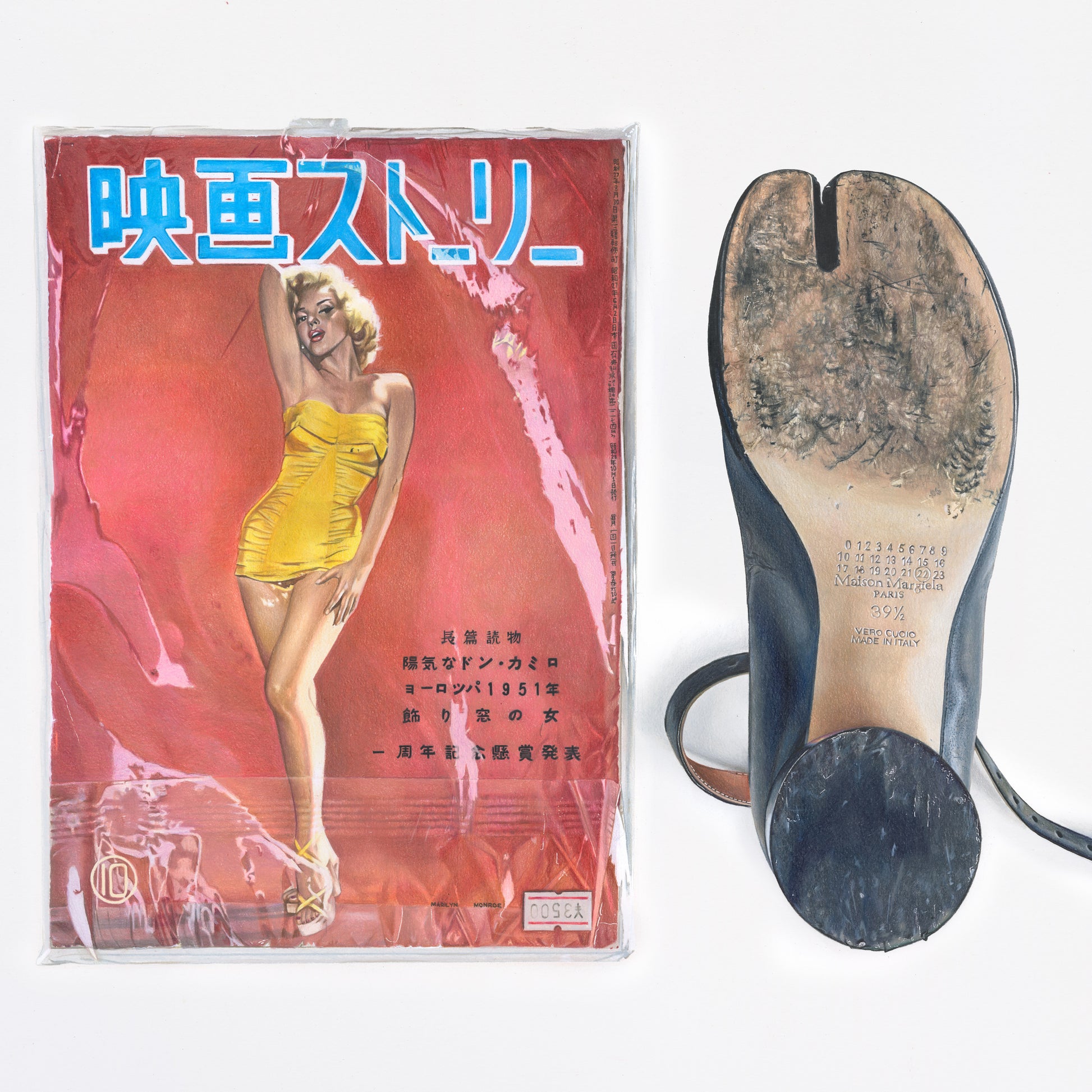 This magazine dates 1951. Only six years after the end of the war. Only six years after the fall of the emperor, and the complete reconstruction of the country's identity, they had magazines of Hollywood, covers of Ms. Monroe. Does it highlight how powerful she was or how powerful the machine of the United States was? Something dystopian in that. On the right, we have the influencing culture on the other foot. The Japanese Tabi shoe can be traced back to 15th-century Japan, through split-toe socks, for both holistic and physical balance for the elite and then, once a rubber sole was added, for the blue-collar worker's standard footwear.