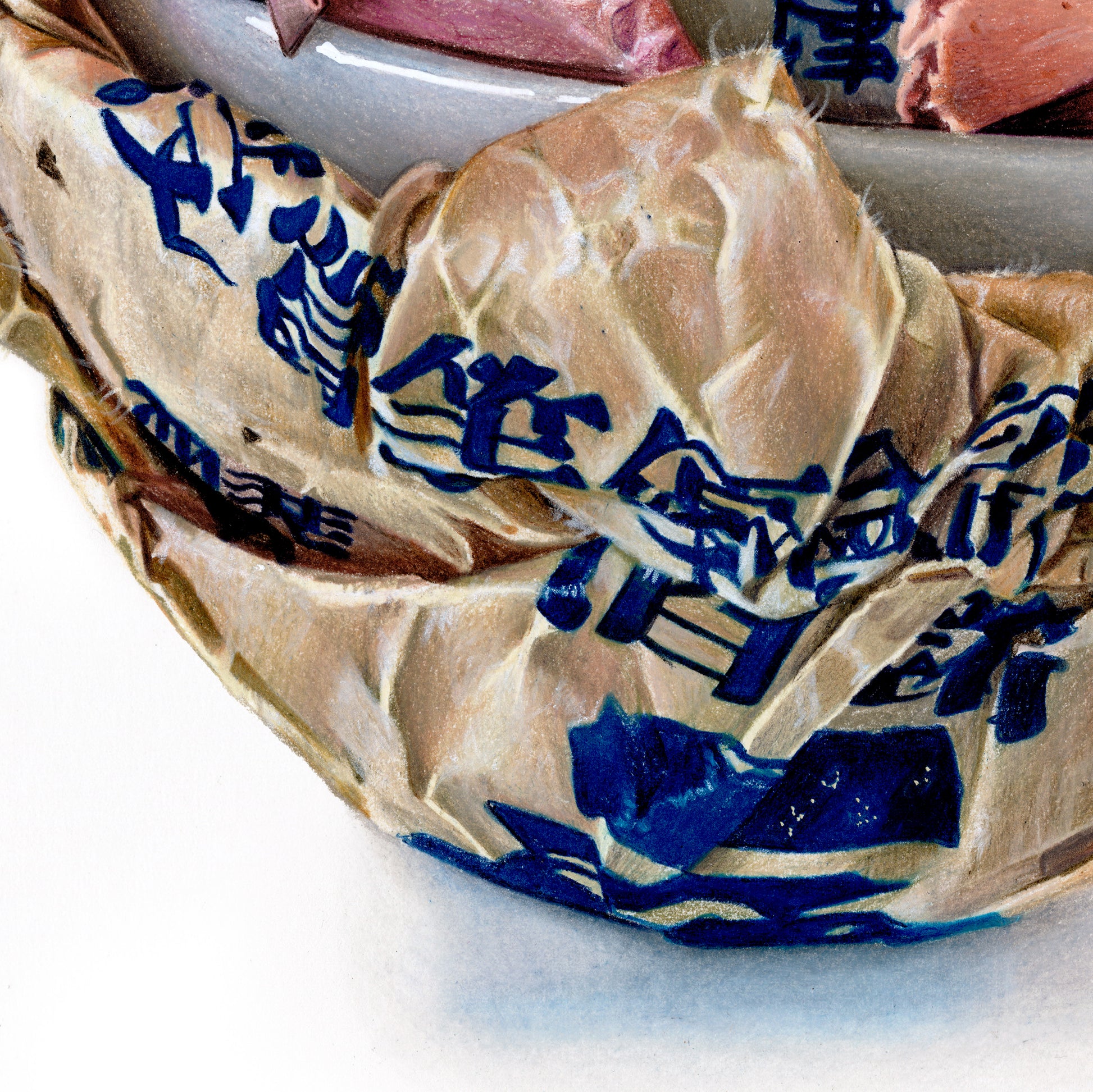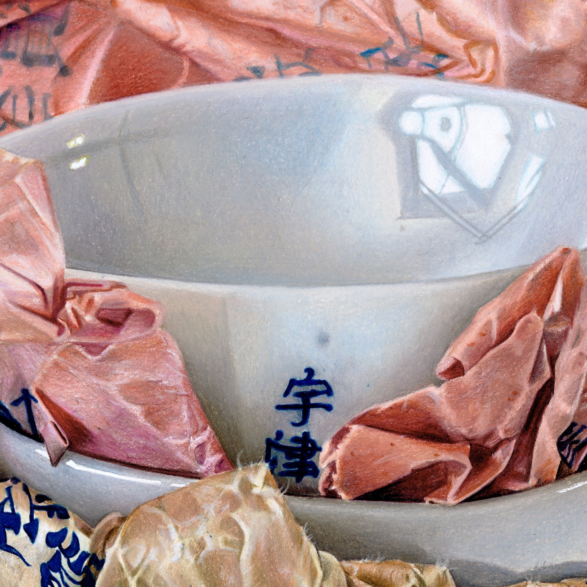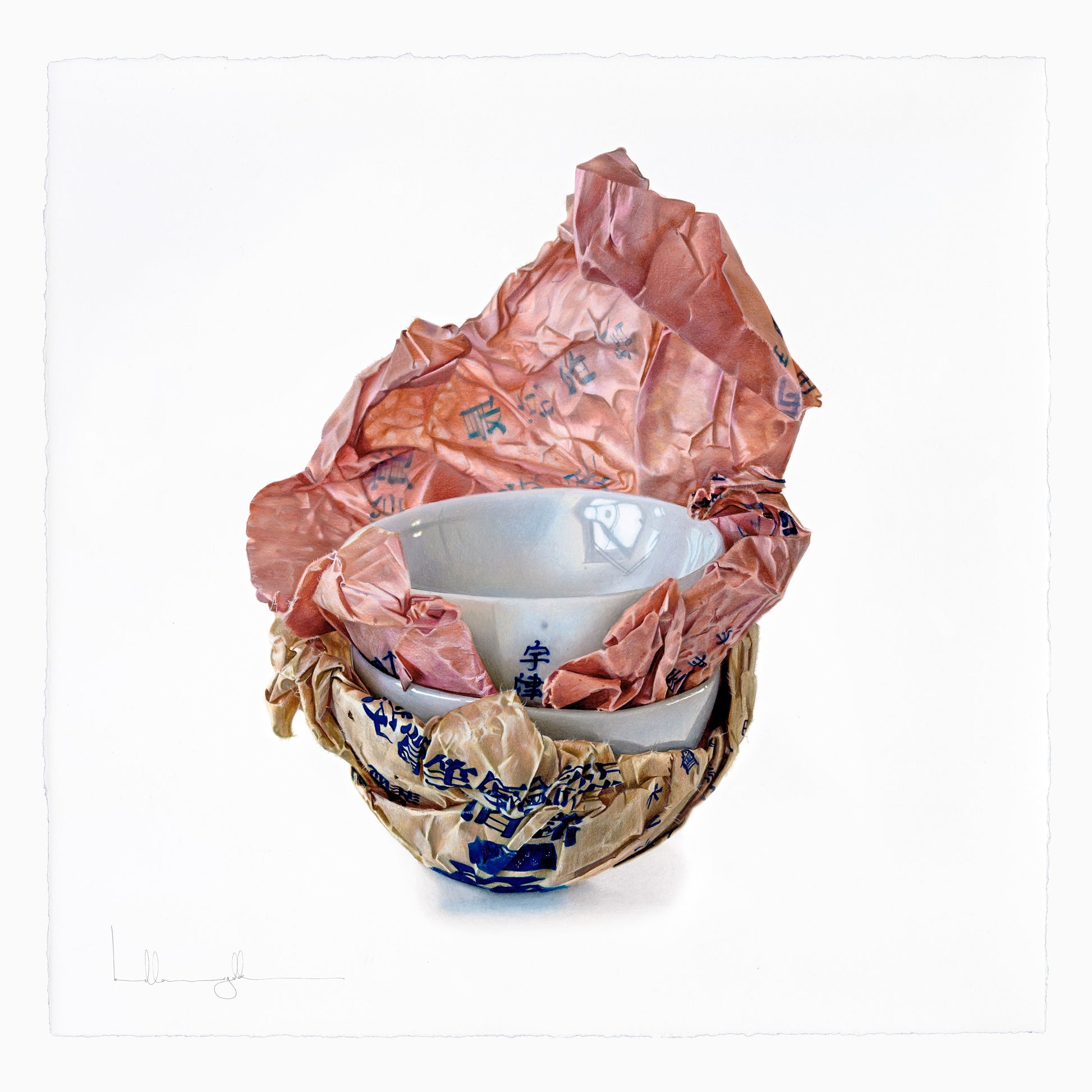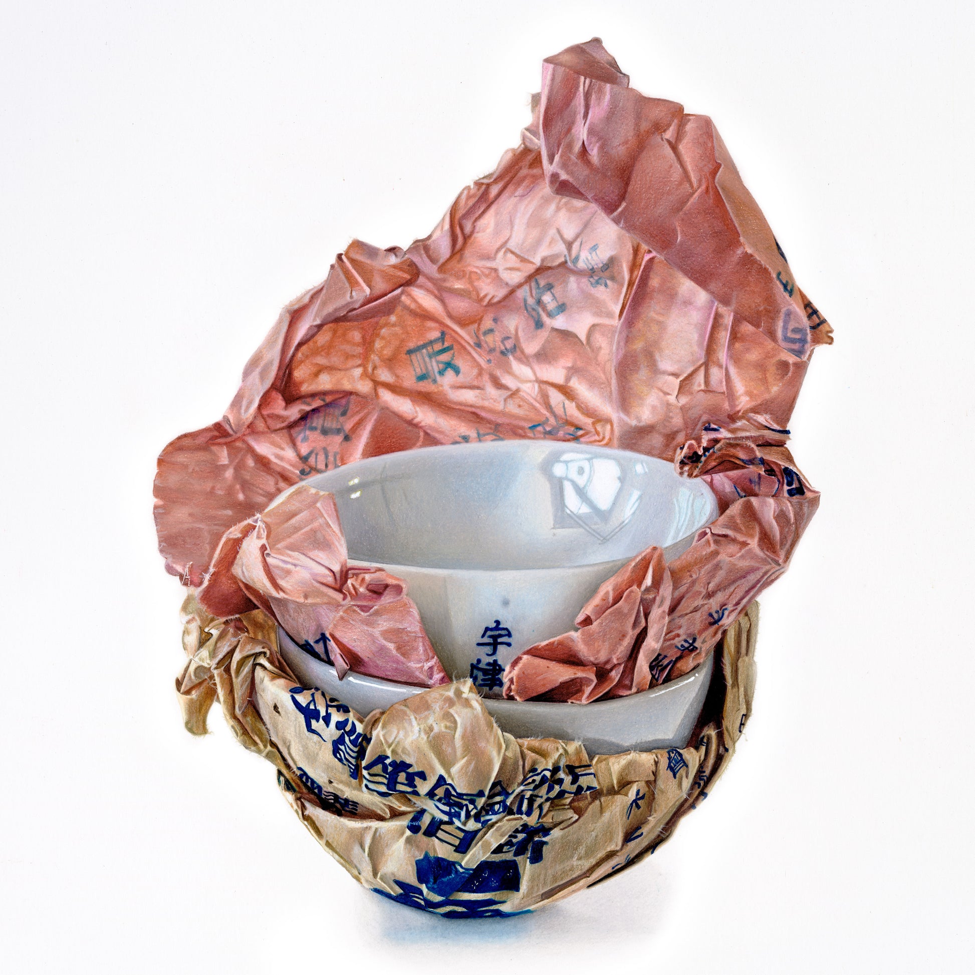 A life’s work could be based around the marvel that is Kyoto. Instead, I had a day. And a lucky one it was to find these bowls. The paper easily represents, without any manipulation by me, the age and care of age, hidden in the creases, in the folds of this well-worn paper, so beautifully complimenting each other in their color pallet and softened into the shape they have been protecting for so many years. These porcelain bowls shall never live without their paper-protecting counterpart, as long as I hold onto them and look at them they shall not.