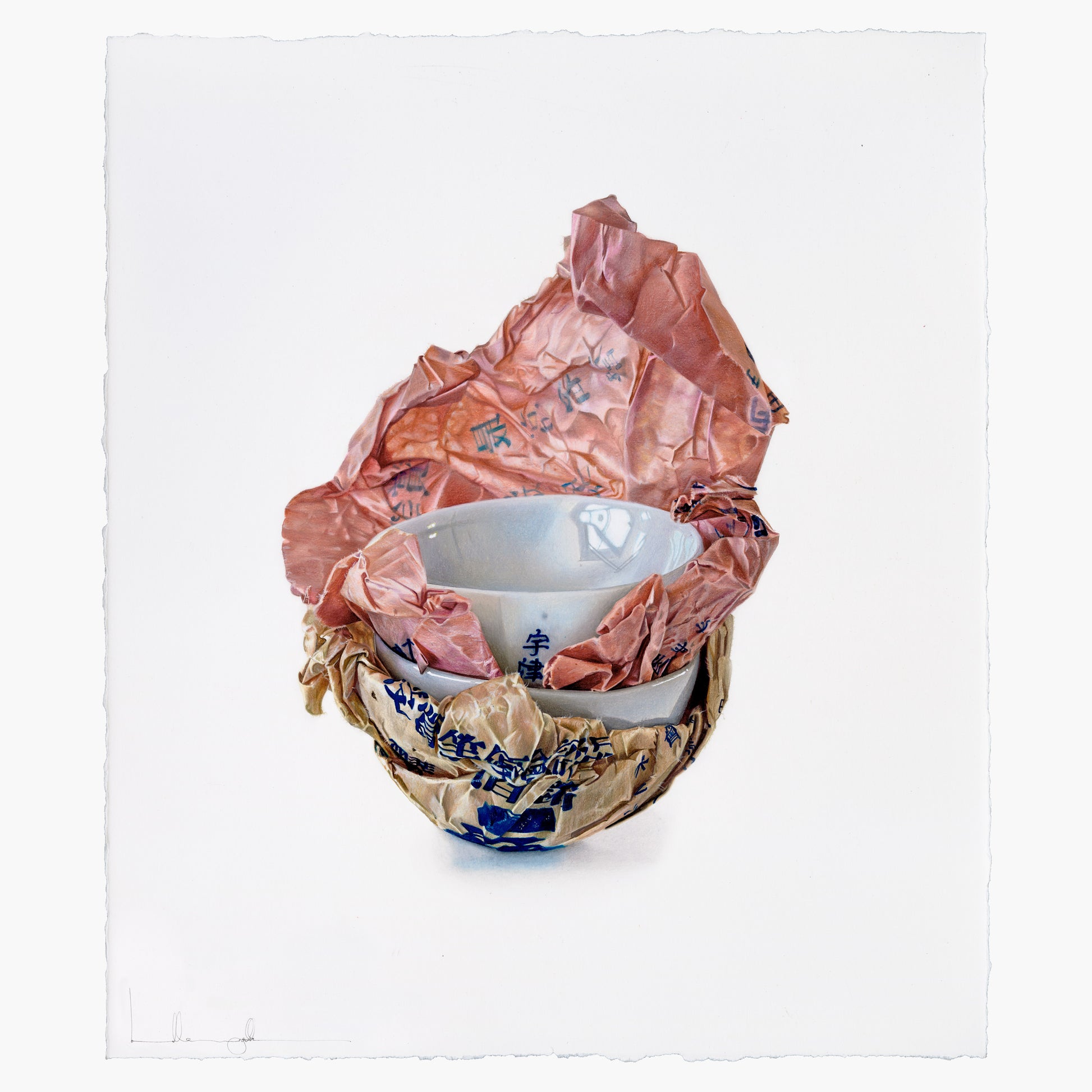 A life’s work could be based around the marvel that is Kyoto. Instead, I had a day. And a lucky one it was to find these bowls. The paper easily represents, without any manipulation by me, the age and care of age, hidden in the creases, in the folds of this well-worn paper, so beautifully complimenting each other in their color pallet and softened into the shape they have been protecting for so many years. These porcelain bowls shall never live without their paper-protecting counterpart, as long as I hold onto them and look at them they shall not.