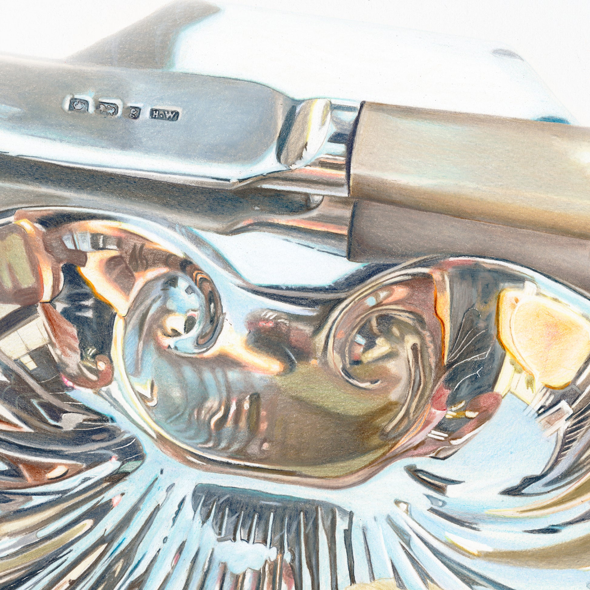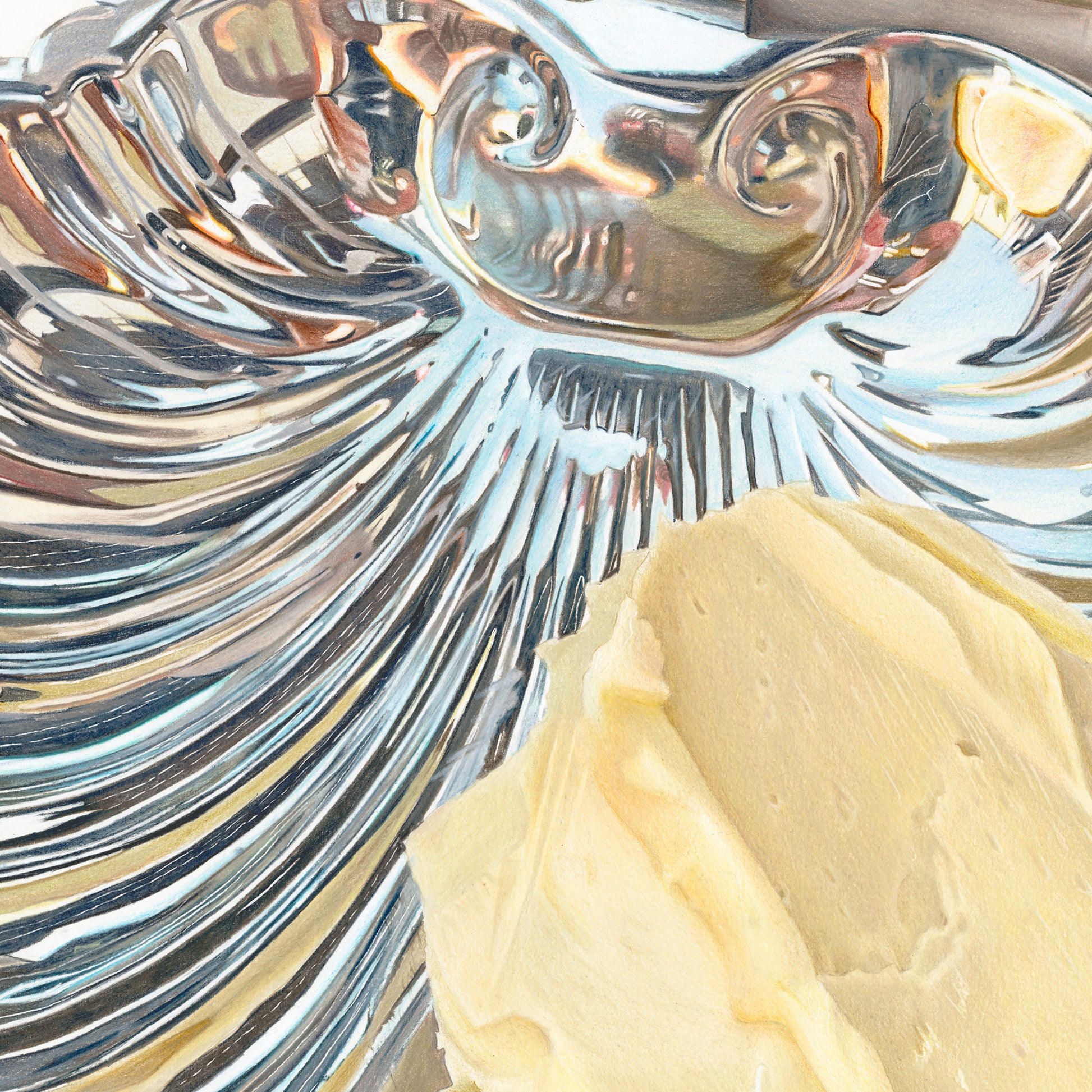 I want you to imagine sitting, a stiff white tablecloth waterfalling onto your knees as the sun hits your back that sits atop a small wicker chair at a small, very full round table. There is wine, there is also sparkling water, there is a silver basket, also starched-napkin-lined, filled with bread, there are frites, and more than you think you can eat. You will eat them all. The mayonnaise and ketchup come separately after you ask. They’re in individually portioned jars that pop as you twist them. The menus are too long for the table so you can make your decision quickly, it’s easy anyway, you know the classics. You know what you came here for. It’s 2pm or 4pm or 9pm without the sun on your back, but the cigarette smoke lingers always and never smelt so unoffensive. It’s only how this outdoor setting is supposed to smell. The butter to your bread is served in a sterling silver clam shell with a pearl-handled knife, and it distracts you from the pedestrians for a moment. Actually, it whisks your heart away and back again, landing it back in the present of this perfect dining experience in Paris, replicated worldwide and in this artwork, but always, only, in Paris.