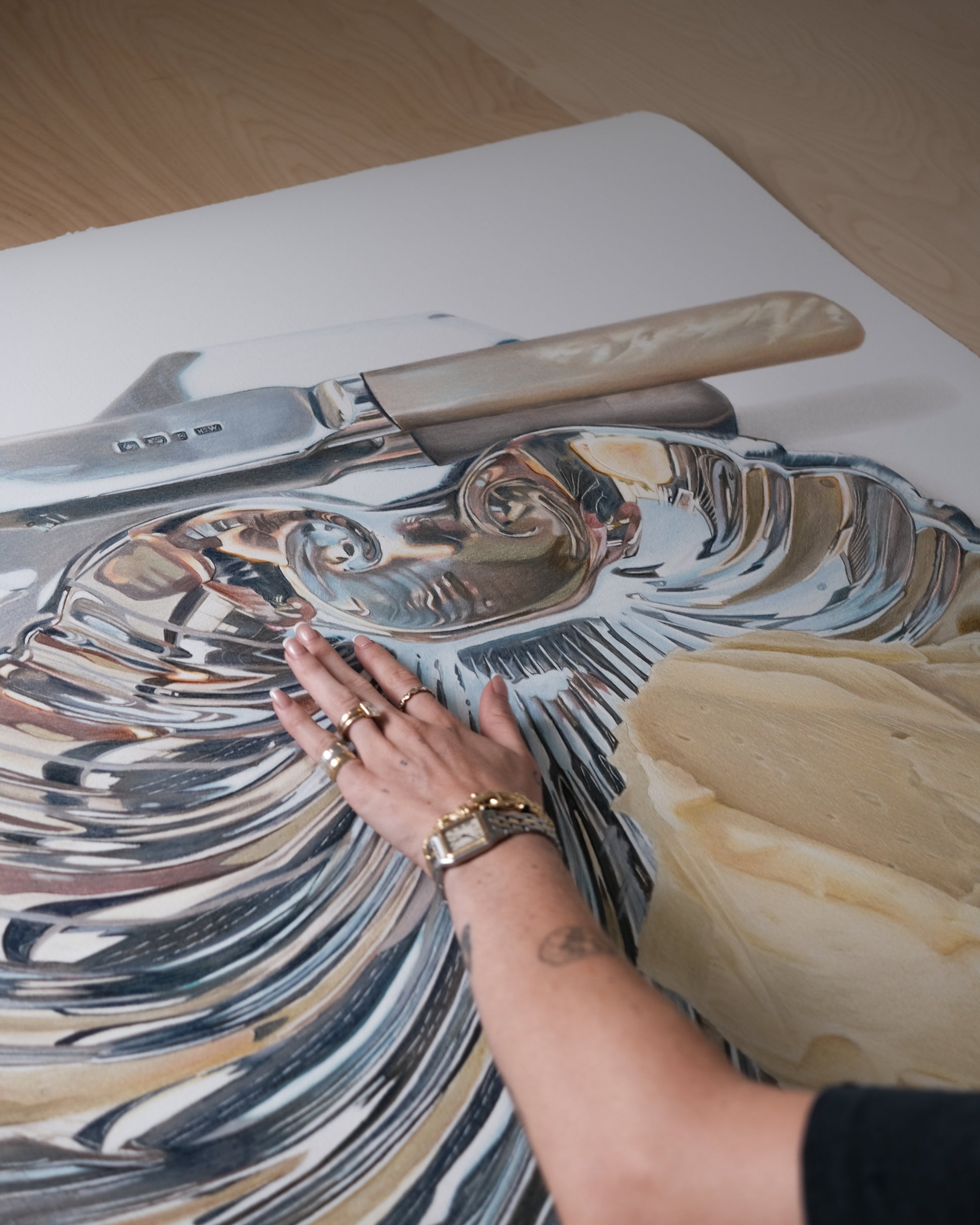 I want you to imagine sitting, a stiff white tablecloth waterfalling onto your knees as the sun hits your back that sits atop a small wicker chair at a small, very full round table. There is wine, there is also sparkling water, there is a silver basket, also starched-napkin-lined, filled with bread, there are frites, and more than you think you can eat. You will eat them all. The mayonnaise and ketchup come separately after you ask. They’re in individually portioned jars that pop as you twist them. The menus are too long for the table so you can make your decision quickly, it’s easy anyway, you know the classics. You know what you came here for. It’s 2pm or 4pm or 9pm without the sun on your back, but the cigarette smoke lingers always and never smelt so unoffensive. It’s only how this outdoor setting is supposed to smell. The butter to your bread is served in a sterling silver clam shell with a pearl-handled knife, and it distracts you from the pedestrians for a moment. Actually, it whisks your heart away and back again, landing it back in the present of this perfect dining experience in Paris, replicated worldwide and in this artwork, but always, only, in Paris.