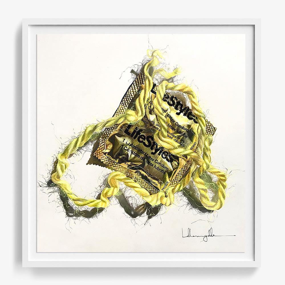 (2019) “I picked up the condom from a very unpleasant and difficult visit to Planned Parenthood. I thought I was just attracted to its texture and reflective surface. When I later photographed it, and paired it with the yellow string, I thought it was its opposite texture that made it interesting. In hindsight, this was a really awful time in my life. My plans had unraveled like the string had and I guess I was trying to immortalize or signify something in my life. Not having the words to do so or even being conscious in my mind, this artwork came out of it. Something that I couldn’t really talk about became art that could mean whatever the viewer wanted from it, and that felt freeing in a way.”