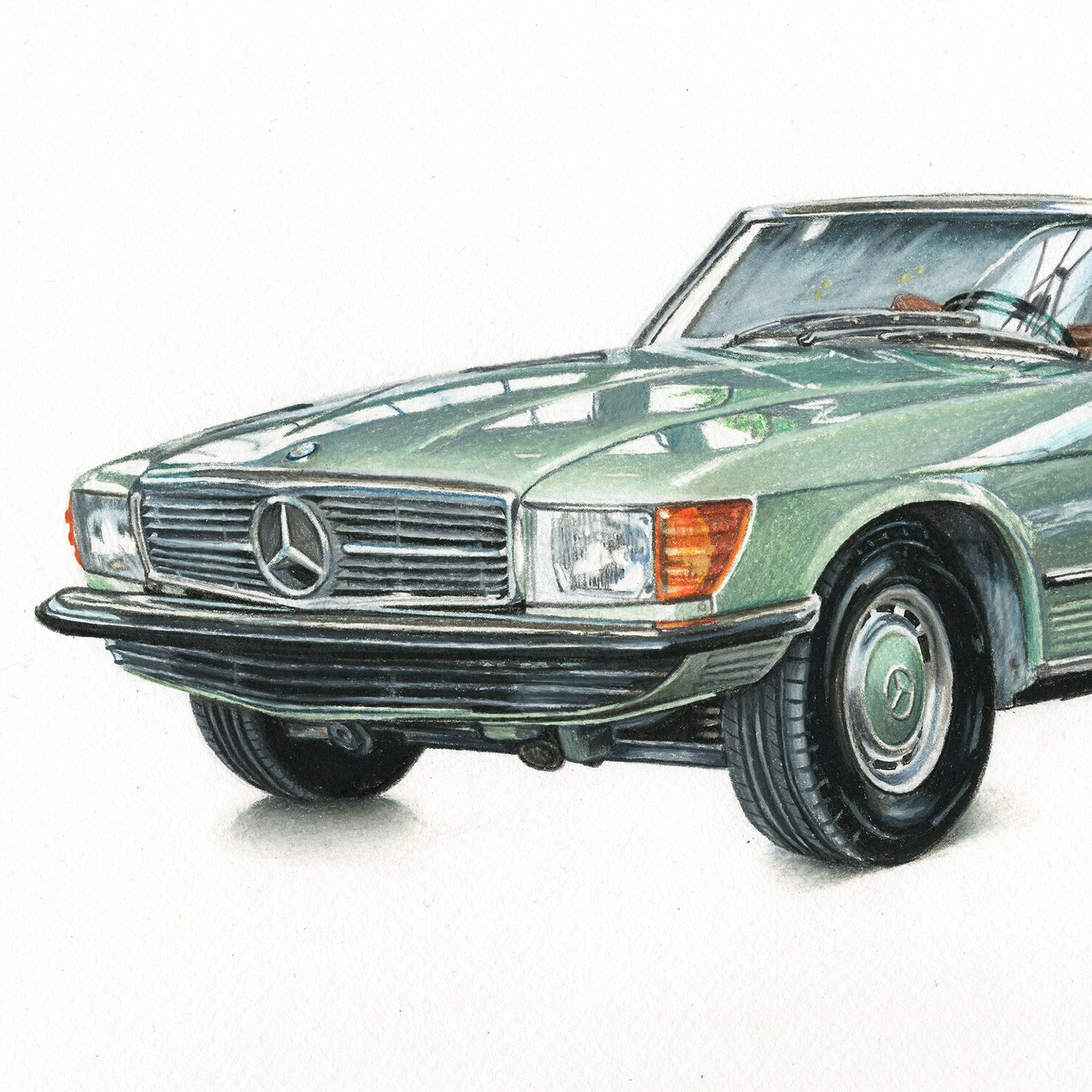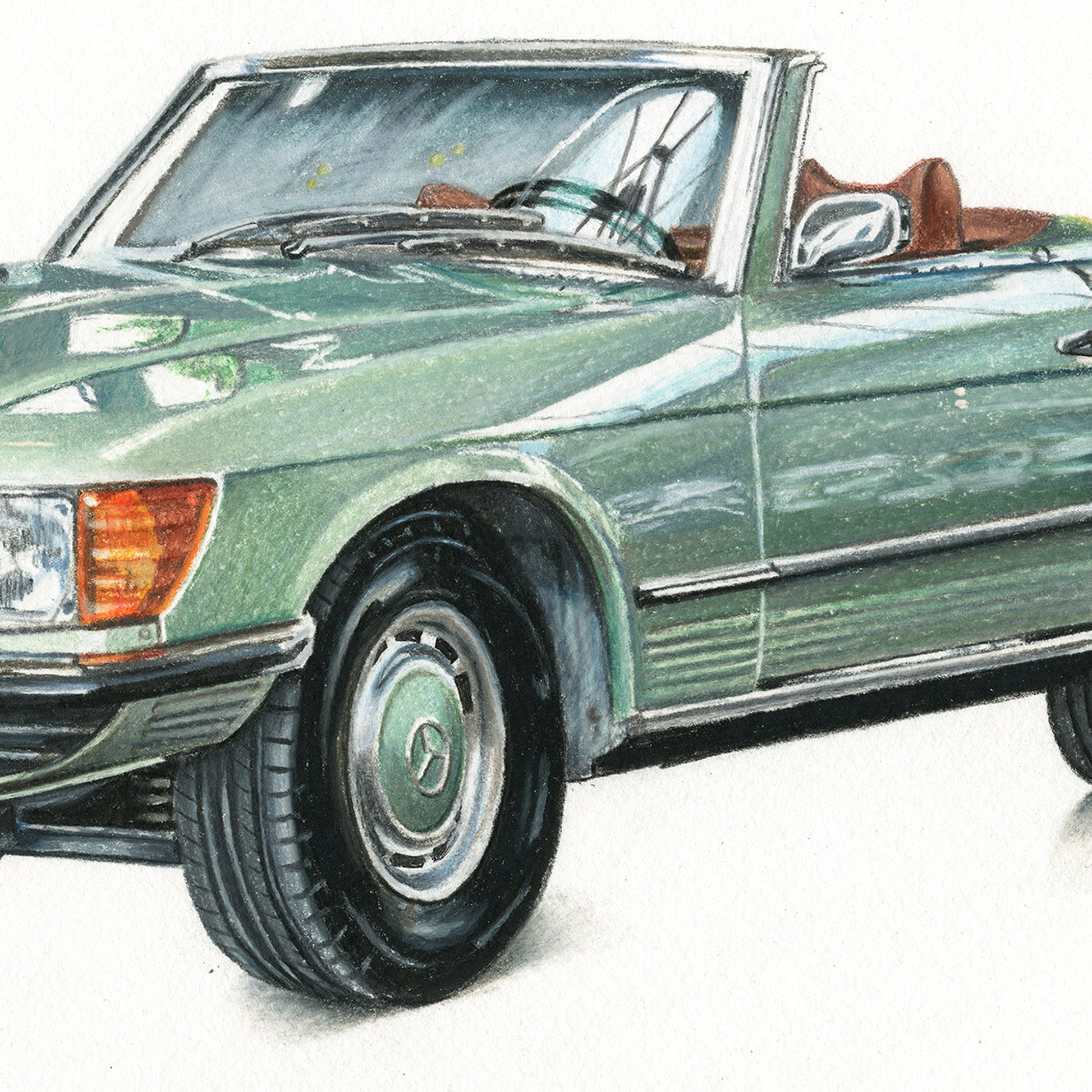 First lesson; Romans drive with a compulsory hand out the window, I think it’s a lifestyle demonstration, a perfect encapsulation of the people, a “we drink the sun, like to relax and drive like no one is watching (or on the roads at all)” attitude. Better yet, top-down baby! Recently drove from Solento to Veneto in a baby girl Fiat 500. Not in anything as slick as this car, but wouldn’t it be nice. I’ve been easing further into car drawings, one might’ve noticed. Firstly I liked their advertisements enough mimic, and hell, look at them long enough, you might start seeing the cars more often around you. She’s not Italian, but can’t you see her in Italy? Tan interior, headscarf adorned, on the passing lane where the speed limits are quiet suggestions and my Fiat is pedal to the metal and not keeping up.