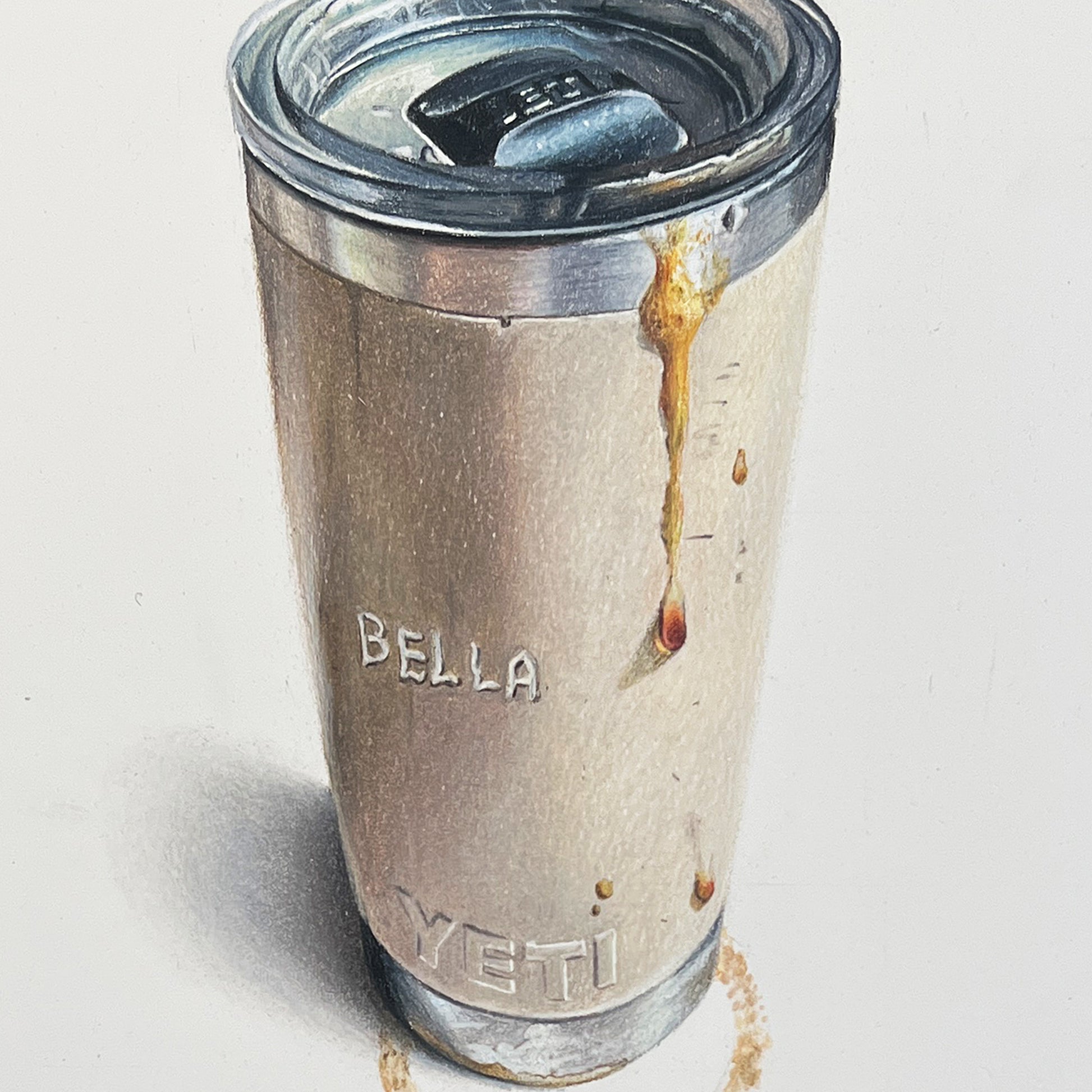 (2023) This is a piece of me. I have two things always and everywhere with me, the Nalgene bottle we designed last year and this Yeti tumbler. The big size, the large-iced-coffee-american-style size. That wasn’t “Americano” it was “American” in its bigger is better kinda way. This thing is indestructible, I think 5 years old at this point and does not miss a plane ride with me. Tyler had a go with a Dremel drill thing and carved in (or out) my name. This is modest though as the other side of the cup has the sticker which some might have seen (seeing as at a time I would pop in them into odd print purchases) of me in a bikini, sombrero, and cowboy boots. I am a reusable cup enthusiast, because, unabashedly I am a Yeti enthusiast. My drink vessels of choice were the main reason I could make friends in Colorado.