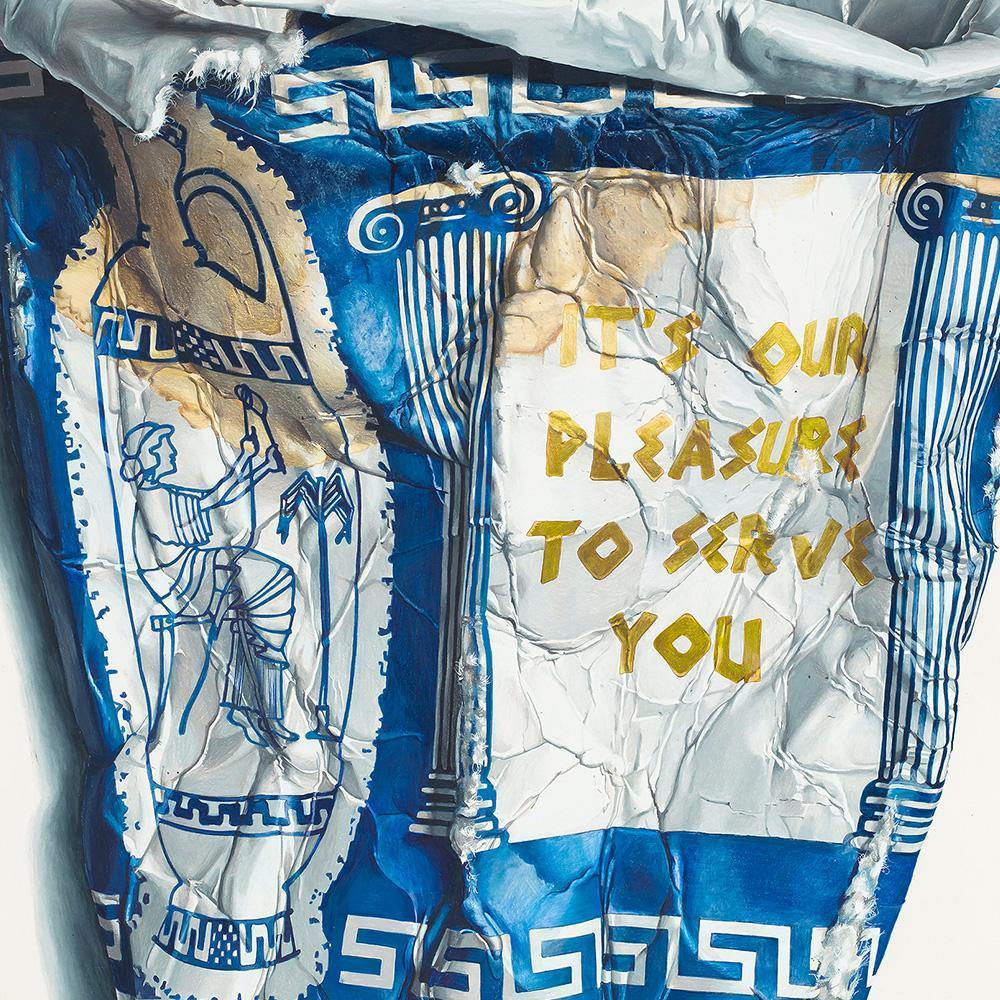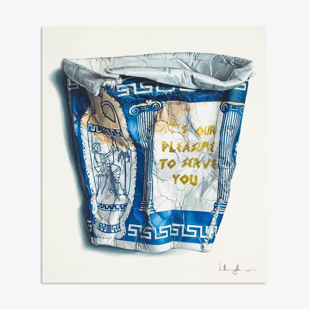 (2019) McGoldrick continues her love affair with the iconography of New York City in her drawing of the Greek coffee cup, more formally known as the “Anthora.” This was the first large-scale subject she drew, and you can see her focus here turn to used and worn pieces of history in her work. The relic is no longer a staple around the city after corporate coffee franchises opened on many corners throughout the late ‘90s, so McGoldrick worked with her local bodega to source it for this piece. The original drawing took 87 hours to complete, helping a piece of New York history live on through her hyperrealistic portrait.