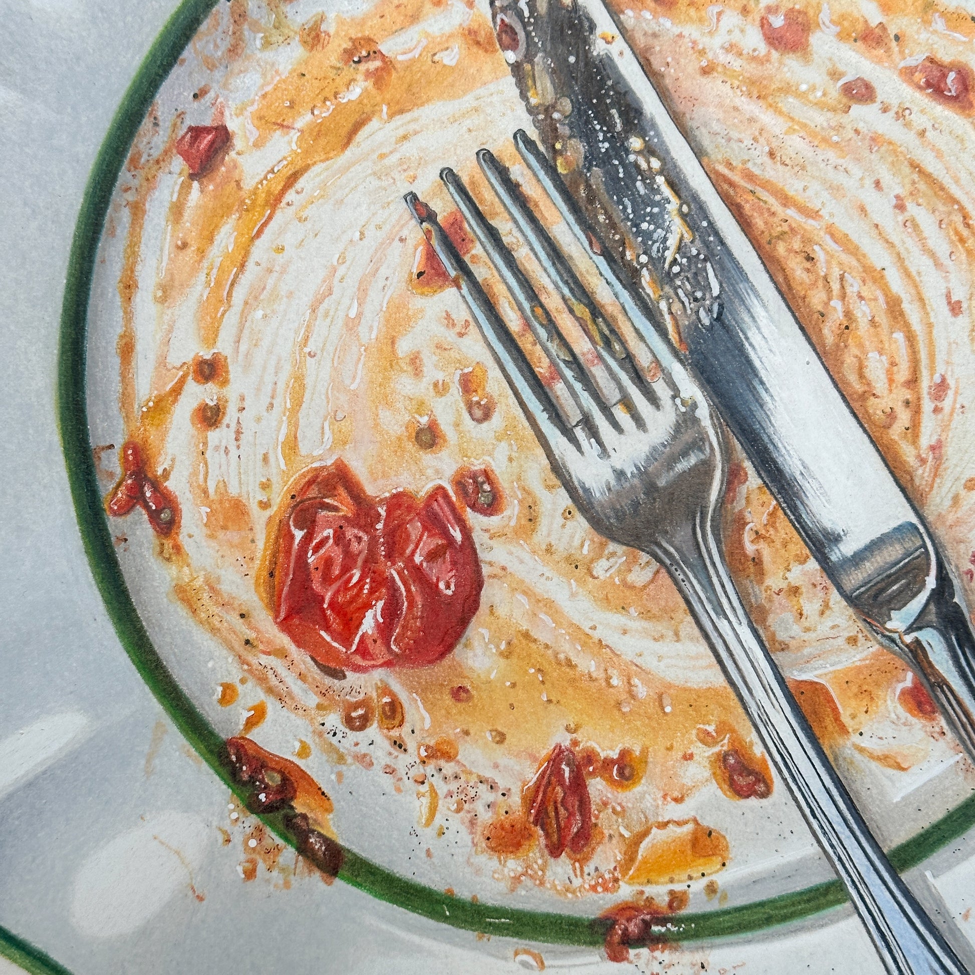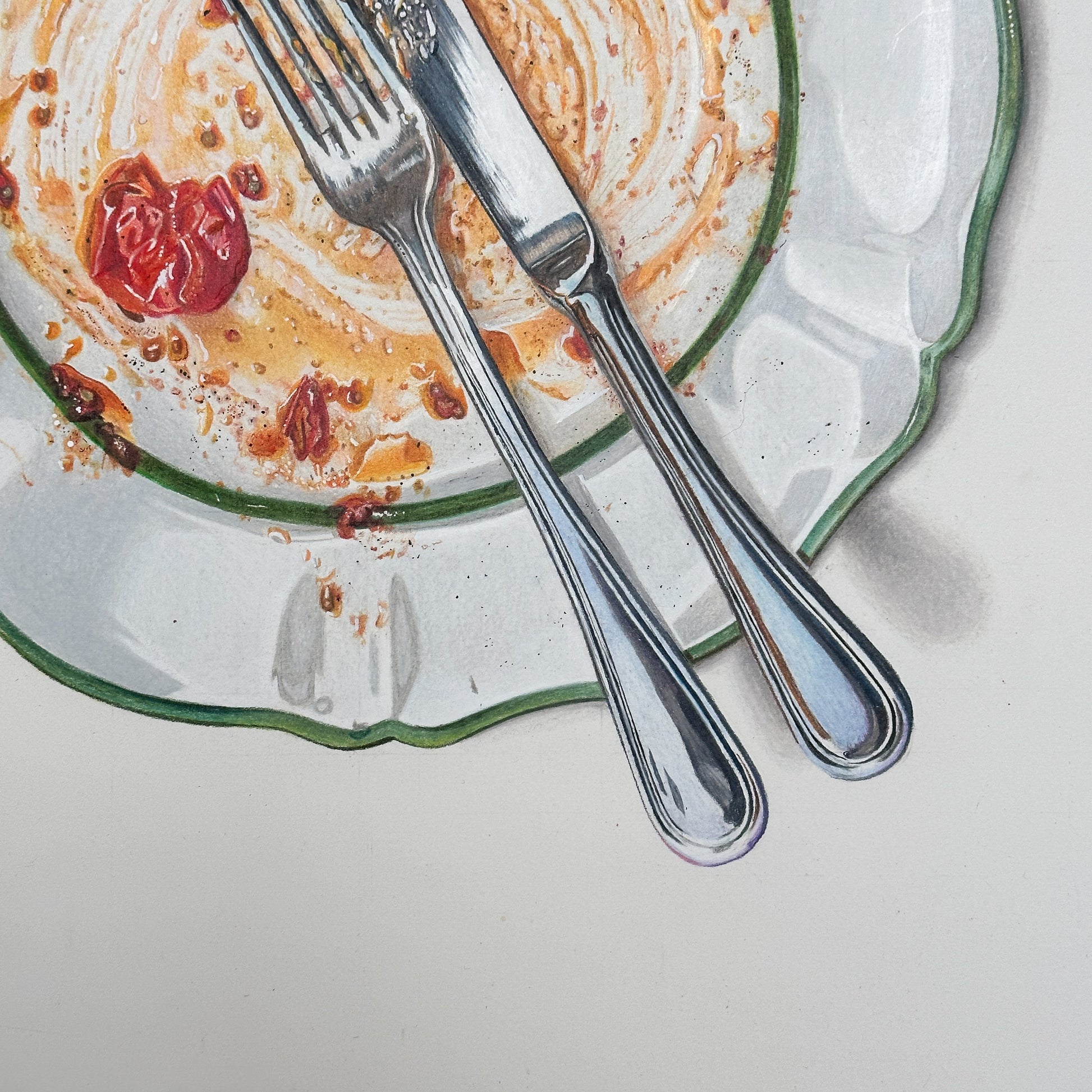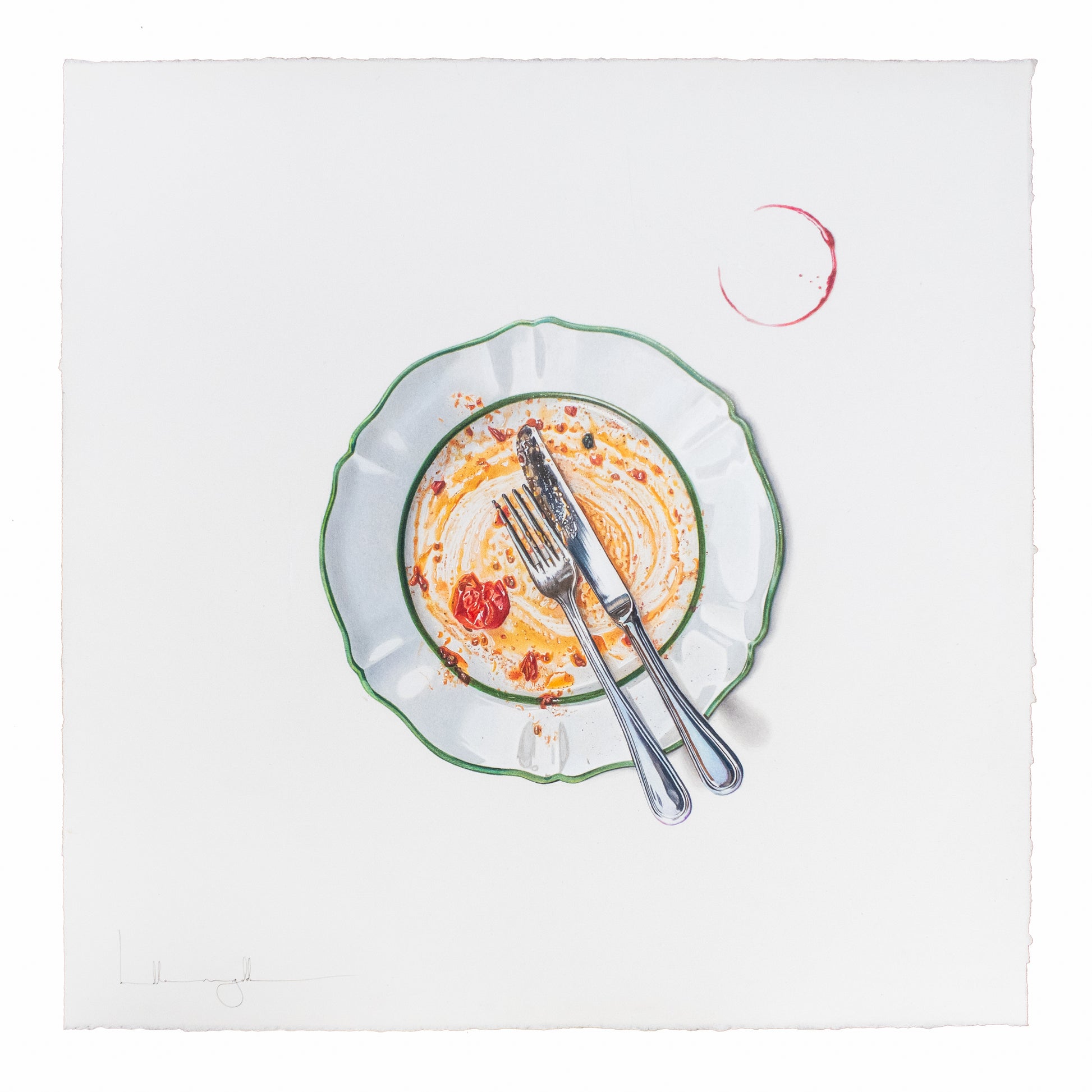 This piece leaves not much room for interpretation yet so much left for the imagination. An empty plate, a ring from a glass. The leftovers. Enough to brag of what’s been had, yet not enough to taste the flavors. But you know. You know, without me explaining it to you, how this spaghetti was twirled around the plate and then around the fork. Sauce, thickened with the cheese once mounted fresh atop the serving, now splashing onto your white shirt and your cheeks as you pat your face with the serviette. You know how you wished it to last longer, then sat back, finished the wine, and wondered if it was time for a sleep or a cigarette. You know it was enjoyed with intention, yet the perfect distraction of a social setting. It wasn’t eaten as fuel but enjoyed ceremoniously. Not as a meal but as a lifestyle. How cliche it sounds but it’s honest. It’s not just a meal.
