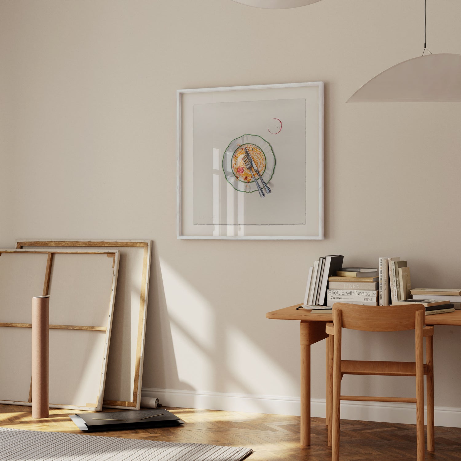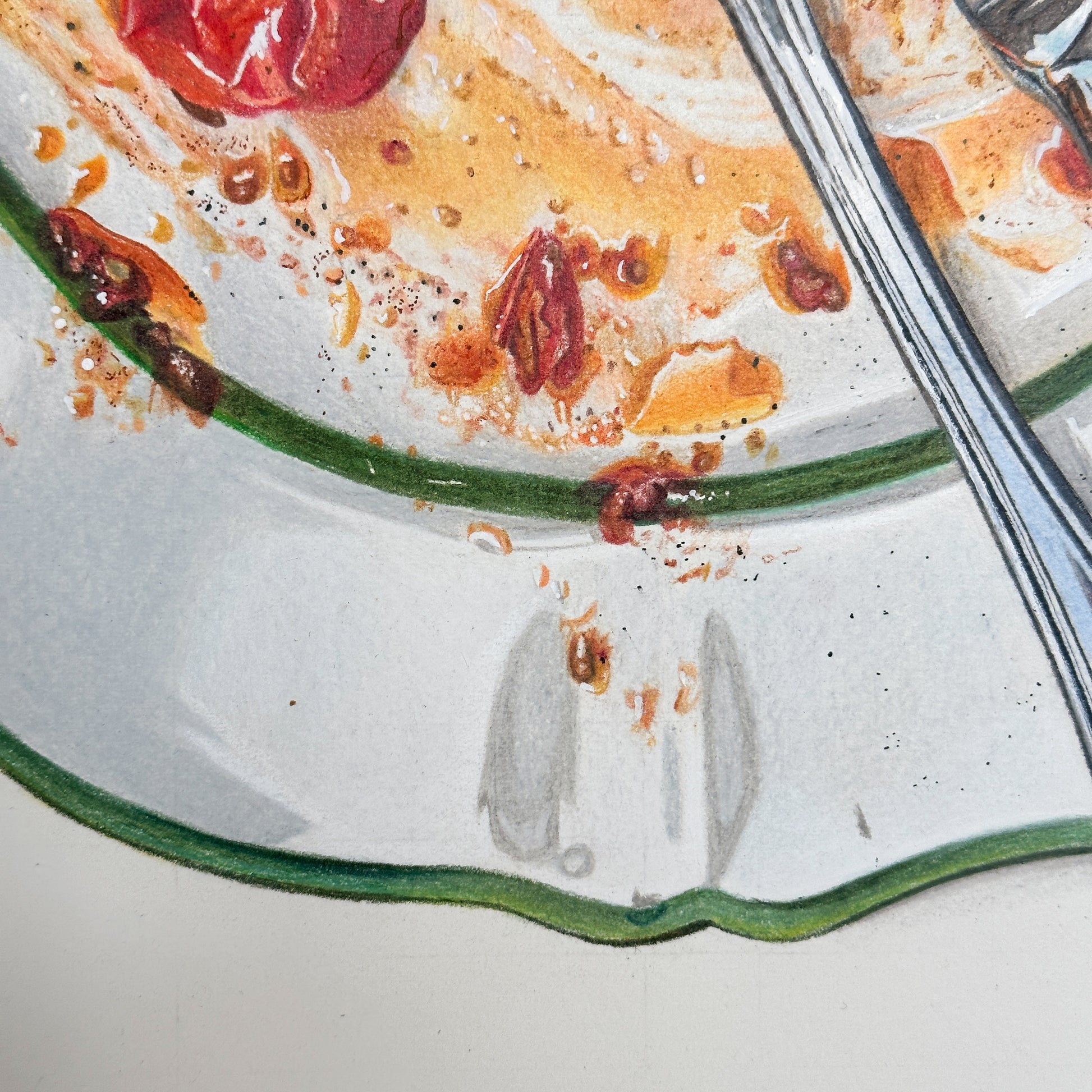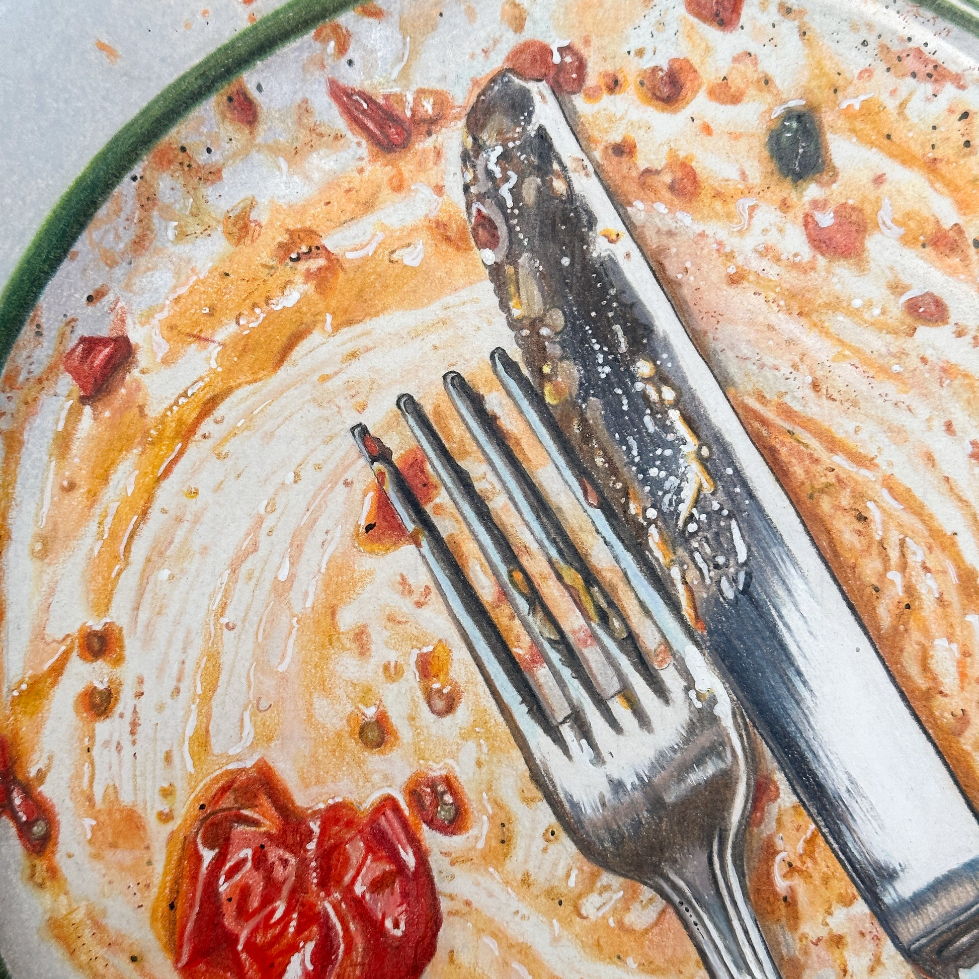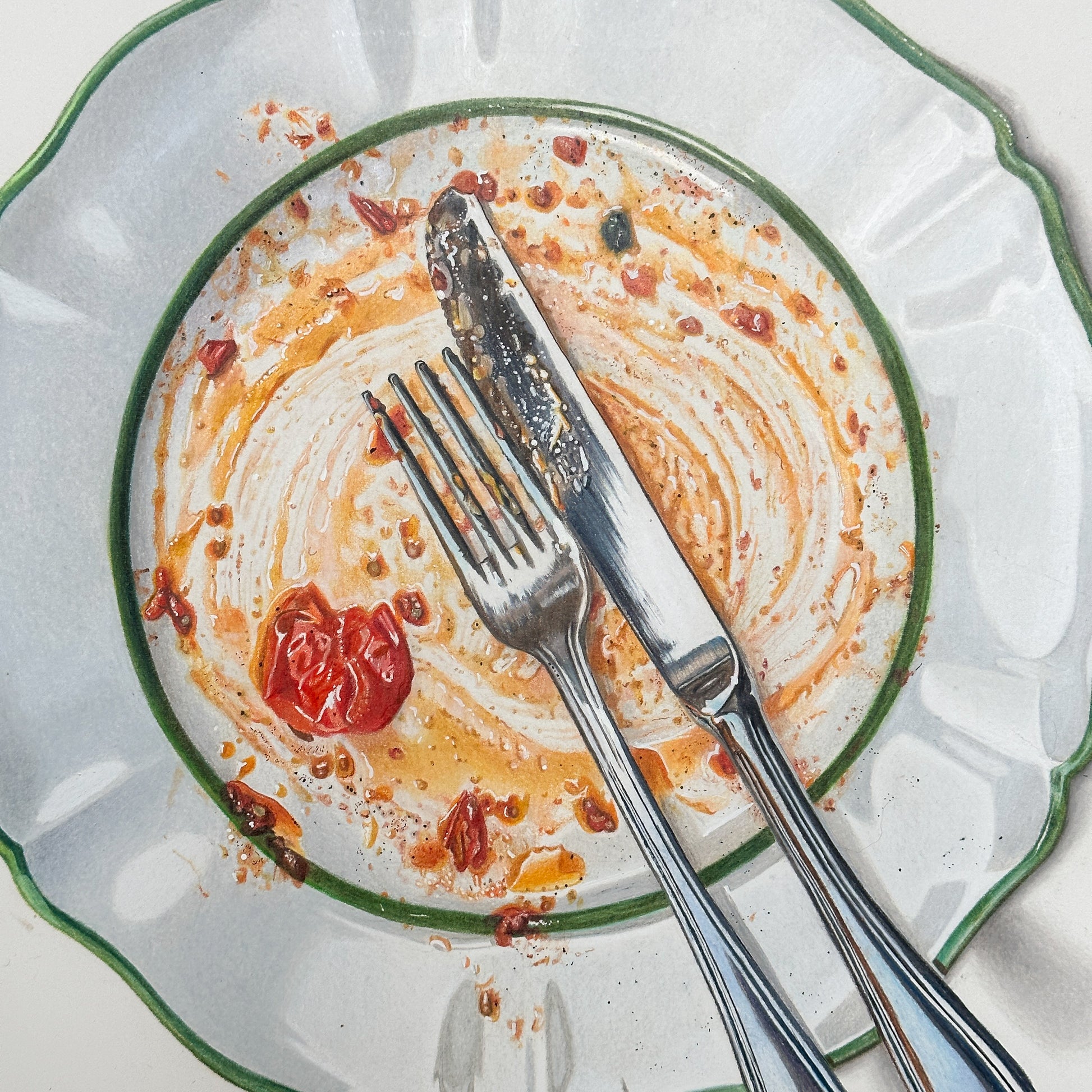 This piece leaves not much room for interpretation yet so much left for the imagination. An empty plate, a ring from a glass. The leftovers. Enough to brag of what’s been had, yet not enough to taste the flavors. But you know. You know, without me explaining it to you, how this spaghetti was twirled around the plate and then around the fork. Sauce, thickened with the cheese once mounted fresh atop the serving, now splashing onto your white shirt and your cheeks as you pat your face with the serviette. You know how you wished it to last longer, then sat back, finished the wine, and wondered if it was time for a sleep or a cigarette. You know it was enjoyed with intention, yet the perfect distraction of a social setting. It wasn’t eaten as fuel but enjoyed ceremoniously. Not as a meal but as a lifestyle. How cliche it sounds but it’s honest. It’s not just a meal.