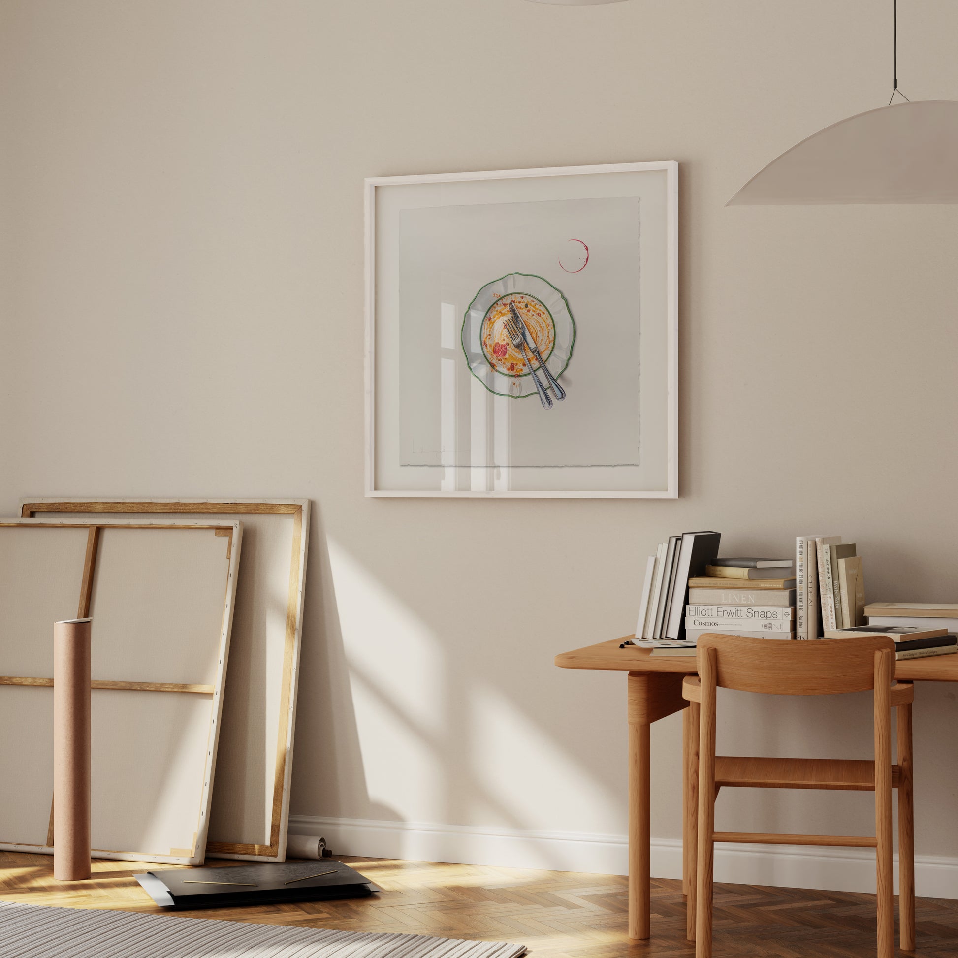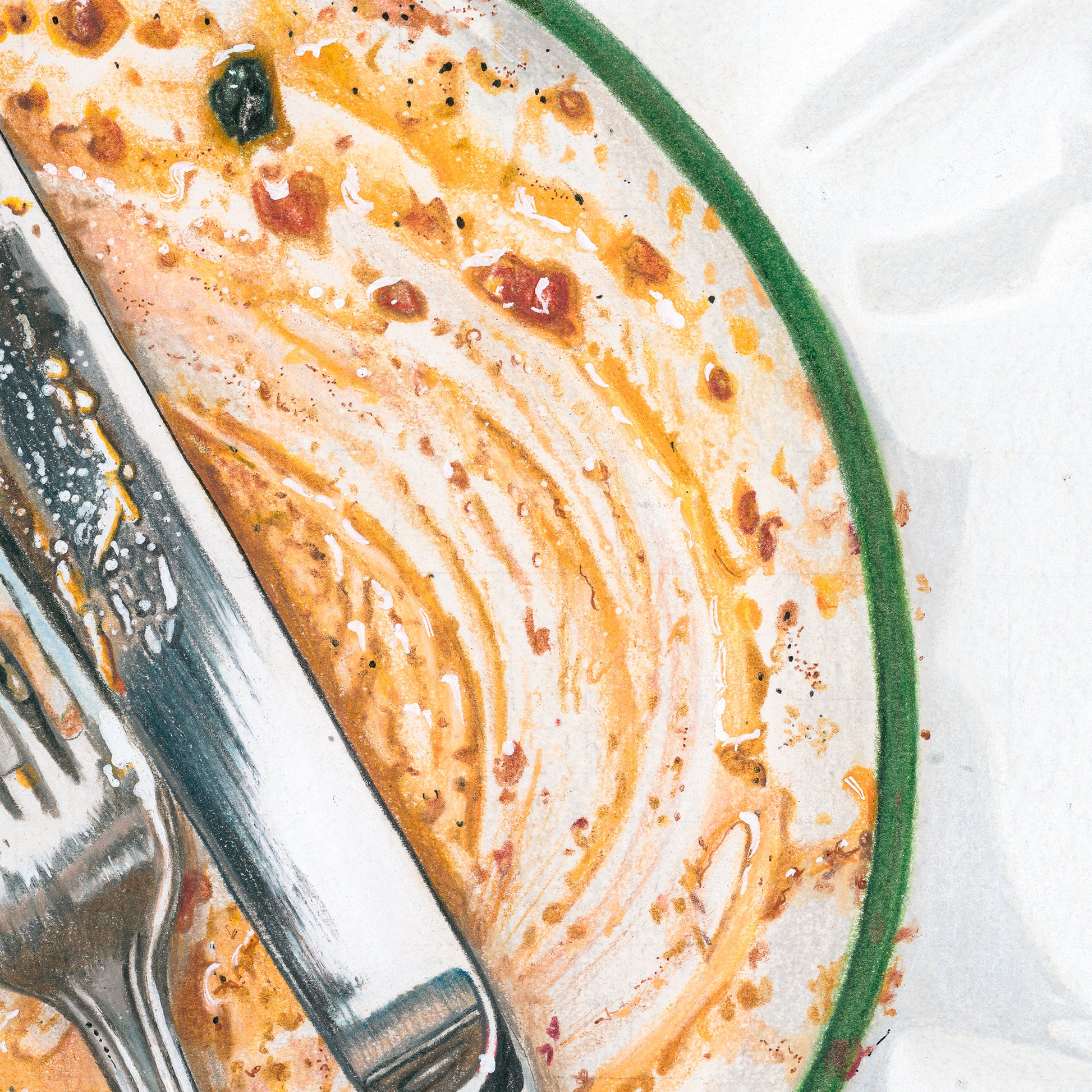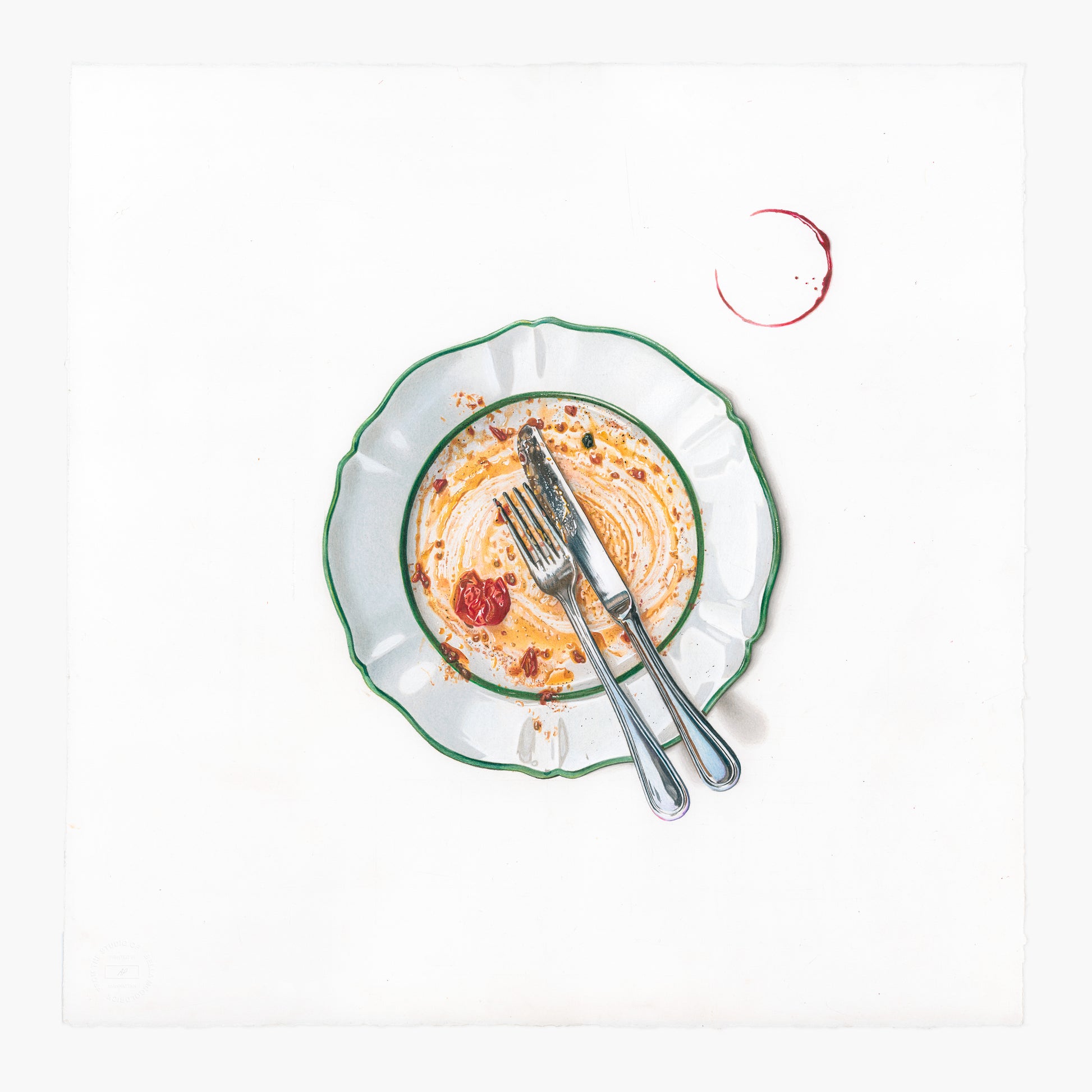 This piece leaves not much room for interpretation yet so much left for the imagination. An empty plate, a ring from a glass. The leftovers. Enough to brag of what’s been had, yet not enough to taste the flavors. But you know. You know, without me explaining it to you, how this spaghetti was twirled around the plate and then around the fork. Sauce, thickened with the cheese once mounted fresh atop the serving, now splashing onto your white shirt and your cheeks as you pat your face with the serviette. You know how you wished it to last longer, then sat back, finished the wine, and wondered if it was time for a sleep or a cigarette. You know it was enjoyed with intention, yet the perfect distraction of a social setting. It wasn’t eaten as fuel but enjoyed ceremoniously. Not as a meal but as a lifestyle. How cliche it sounds but it’s honest. It’s not just a meal.