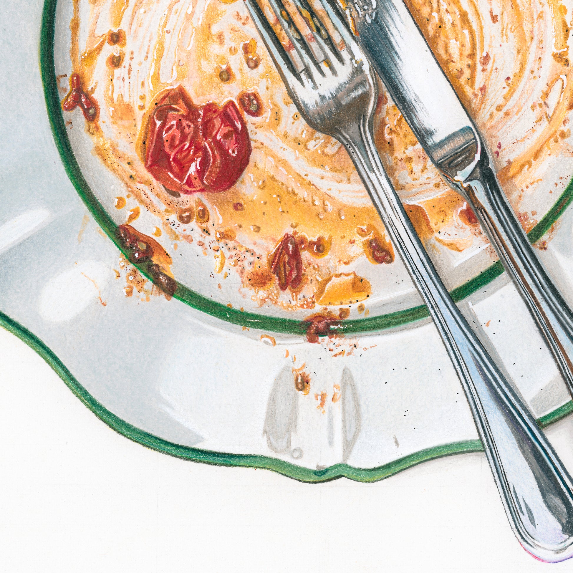 I could have drawn the tomato, but that removes the context. Here, we have an undeniable, perhaps the most famous of dishes; Italian pasta. A devoured plate of pasta and wine whos glass is removed for a refill. The meal has been had, but the conversation continues.