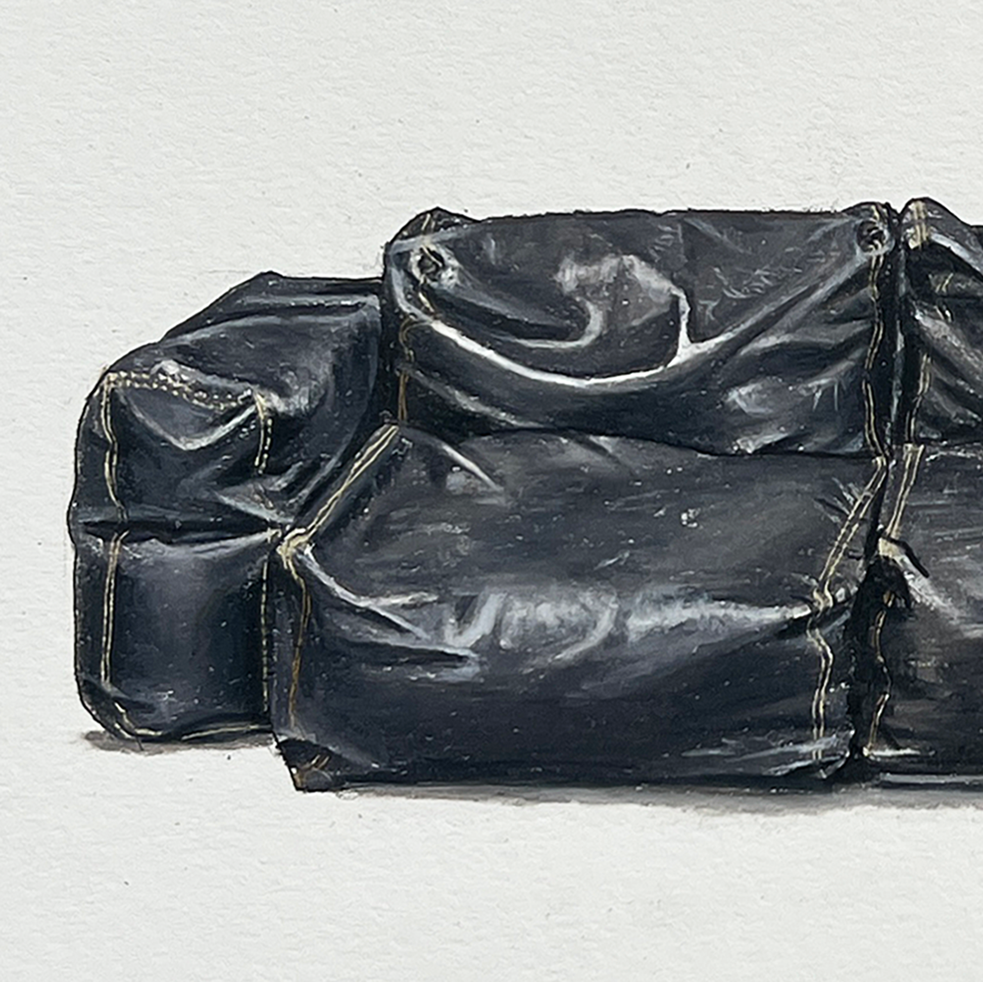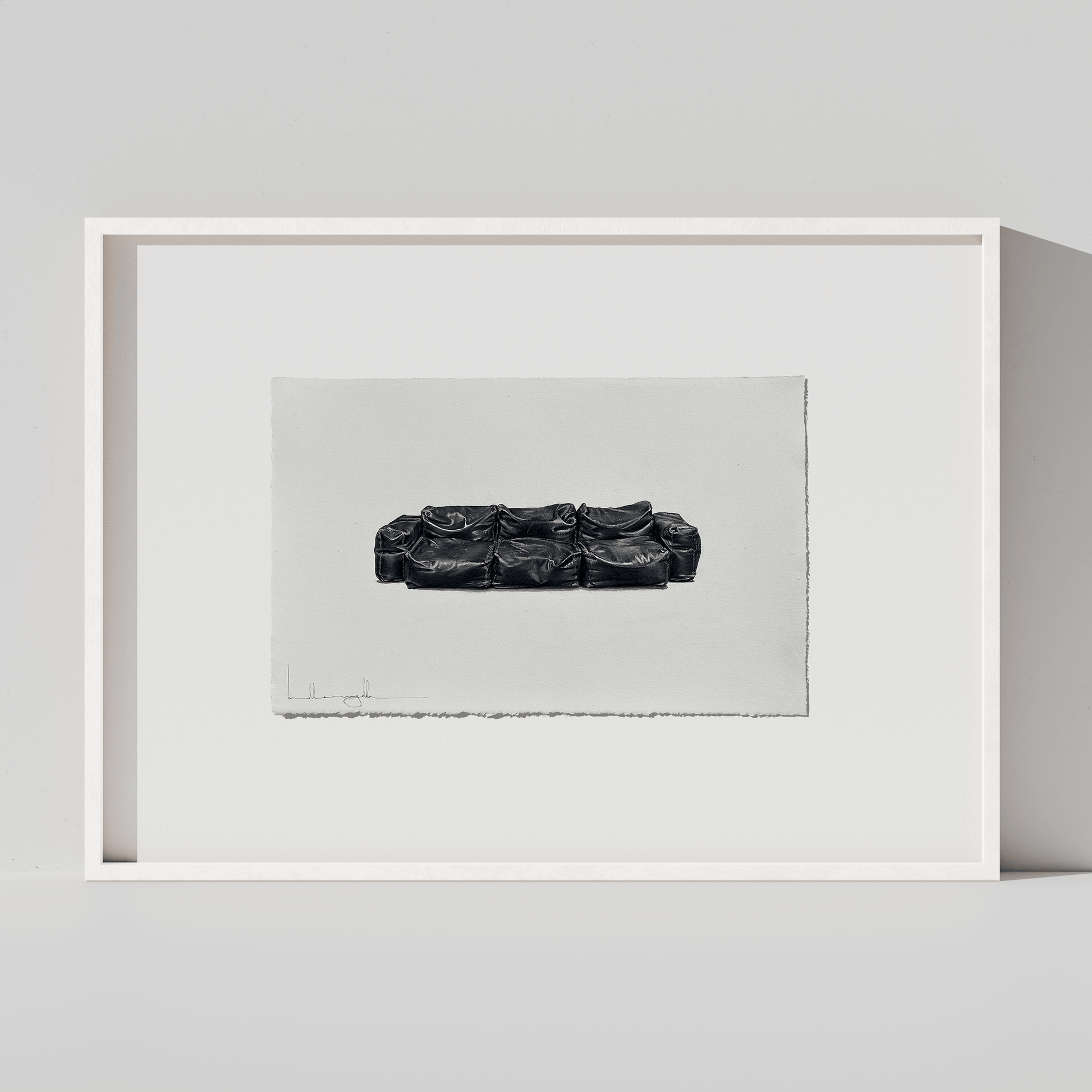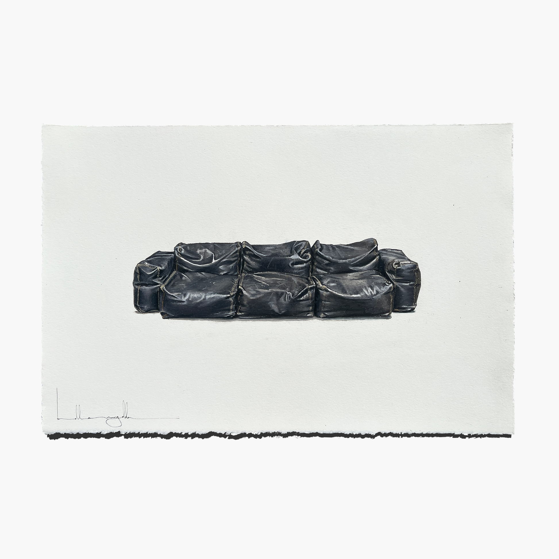 (2022) This sofa sits on the line of janky-basement-couch-you're-scared-to-sit-on and designer sofa that looks chic and classy - a real room elevator. It's the second. I think this couch needs a little negative space as it has in the drawing - that's how I would position it in a room. It's got that "cool" vibe being so used - like a banged up Birkin Bag - nothing speaks cool as much as expensive things trashed from good use.