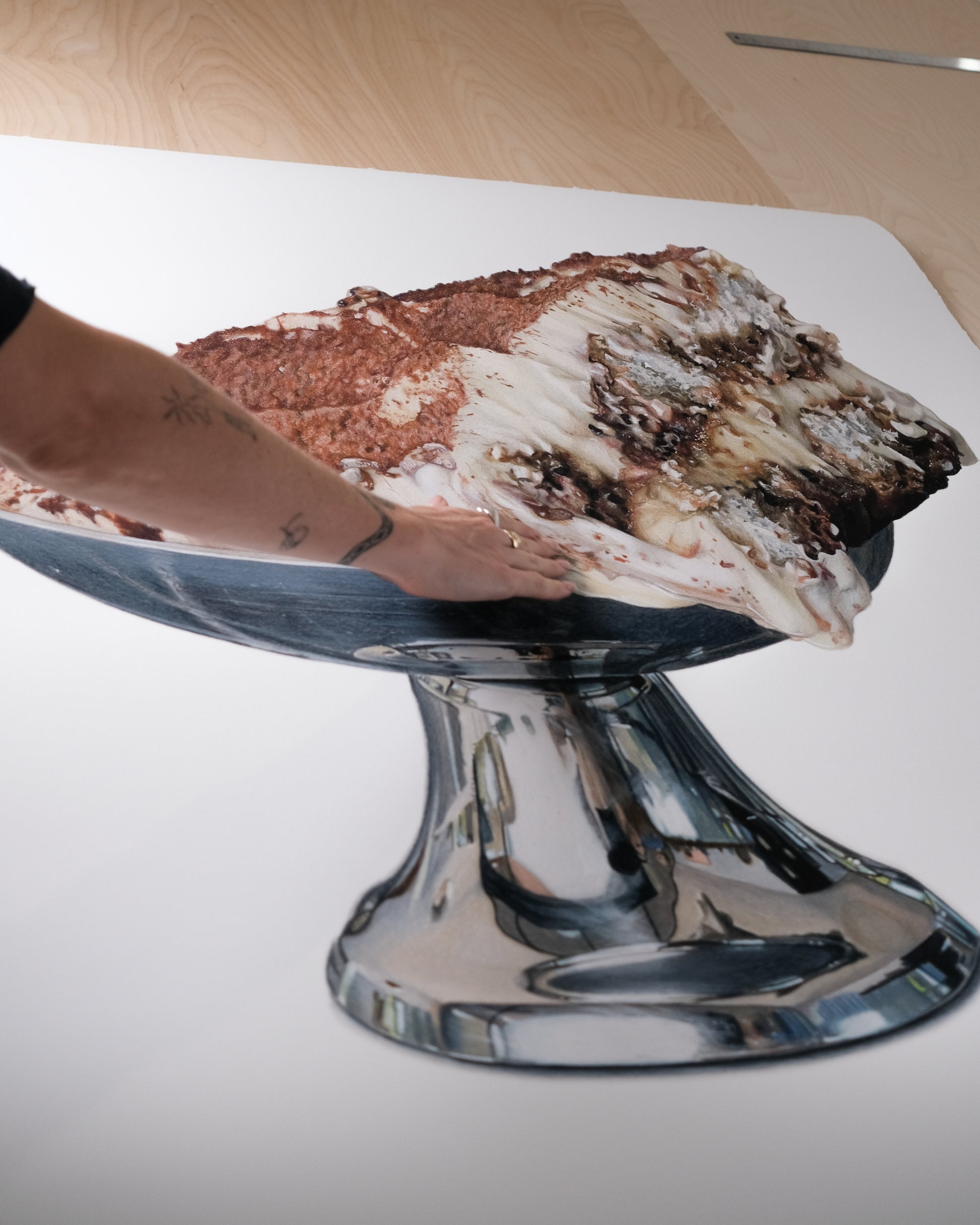 I like ugly. I like messy, wet, raw and used. I too, like shiny things, as any good and attention-seeking woman does. I want sharpness with my chaos. Disheveled placement with an intention and purpose. I want those watching to wonder whether it perfectly came together at the last minute or if my manipulation made it appear just so. Cream pooling into a first drip, a melting which hints at time. The anticipation of the changing states of food, what was ripe will soon be spoiled. Time-sensitive, I hope to deliver a light dusting of anxiety under the heavier dusting of cocoa powder. I like cream still cold from the fridge. I like to lick the bowl, the spatula, and the mixer after the icing has been whipped and layered. I like coffee in the afternoons. I like to pretend I’m Italian, eating dinner well into the night and dessert into the early morning. Aperitifs between courses, cigarettes between conversations, coffee between mascarpone, between sugar, between cocoa. I like the way I can see my reflection in silverware. I like the way layers are visible yet indivisible. I like my tiramisu messy, cold, ugly, rough and ready.